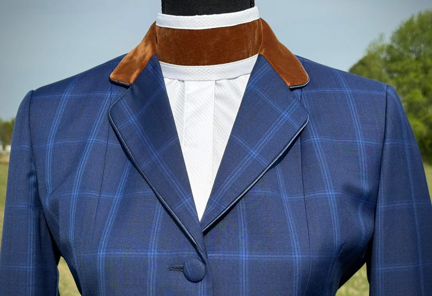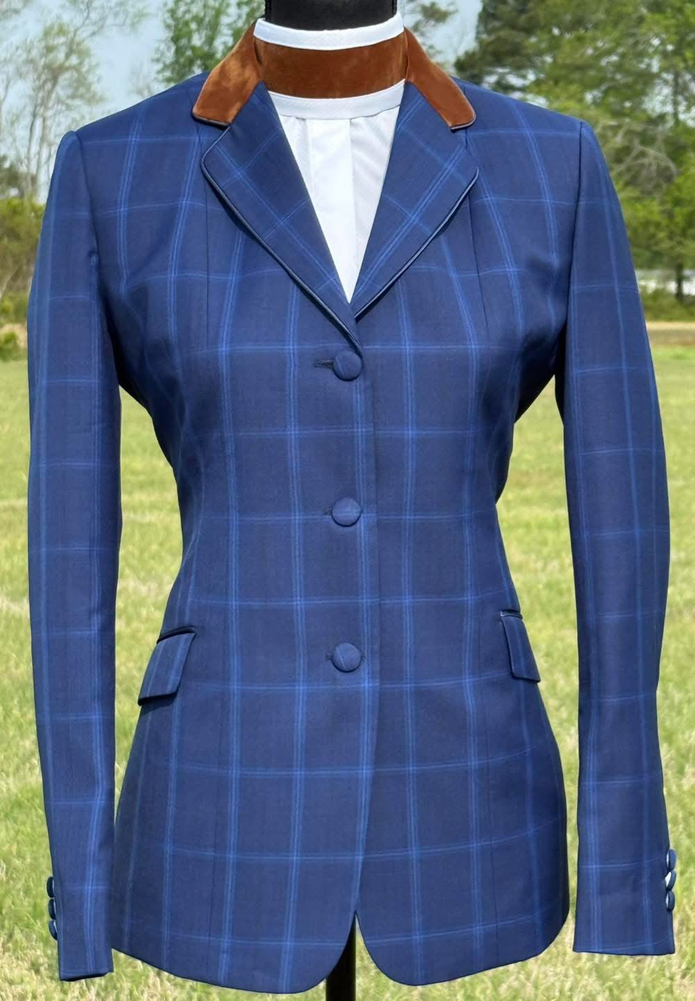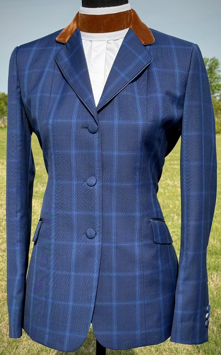 Blue plaid Boo Yah jacket with blue piping on the collar. Camel velvet. Size 12. Please refer to size chart.