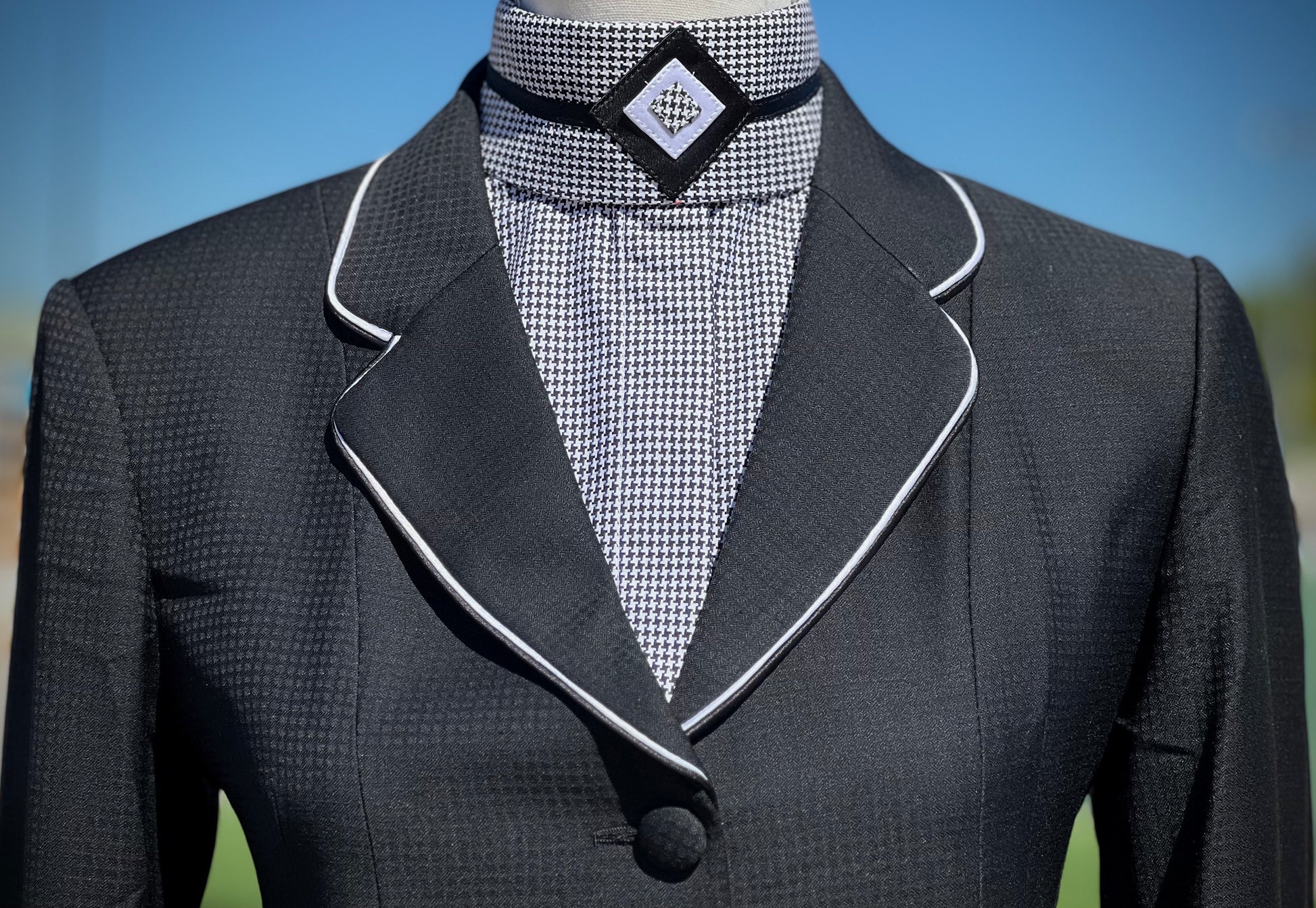 Black and white houndstooth Boo Yah hunt shirt with thick black ribbon piping (not pictured) and black/white open diamond collars. Size 38. Please refer to size chart.