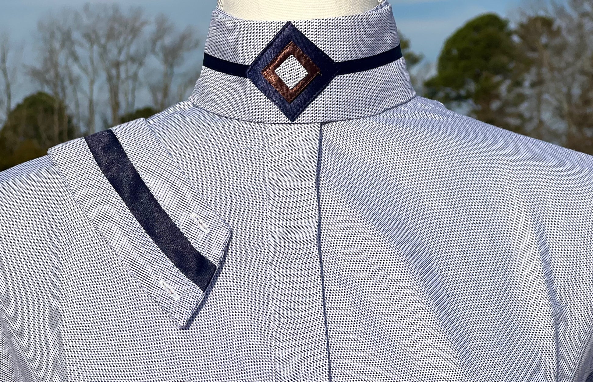 Boo Yah Blue/Brown Shirt with Thick Navy Velvet Ribbon Piping and Black/Brown V Collars - Size 32