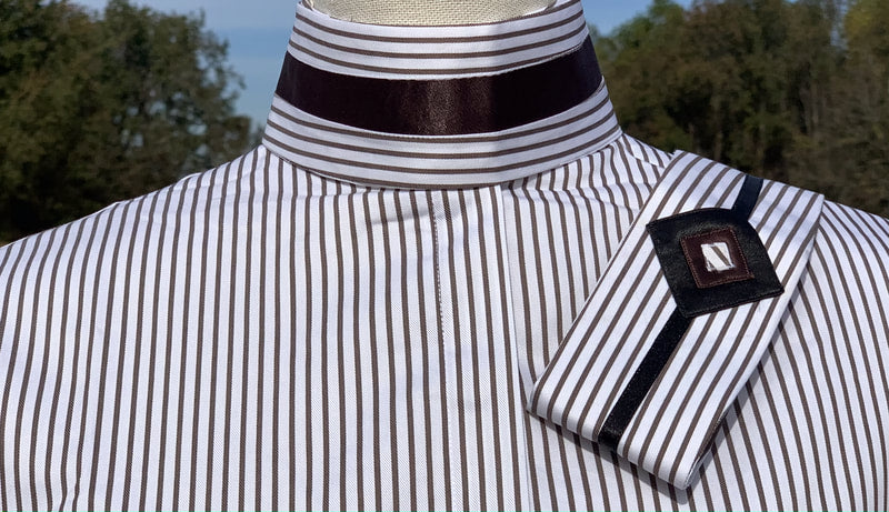 White with brown stripe Boo Yah hunt shirt with thick brown satin stripe and black/brown open diamond collars. Size 34. Please refer to size chart. This item is a FINAL SALE.
