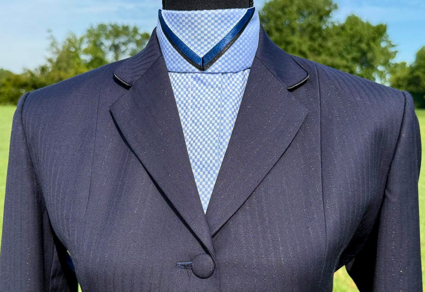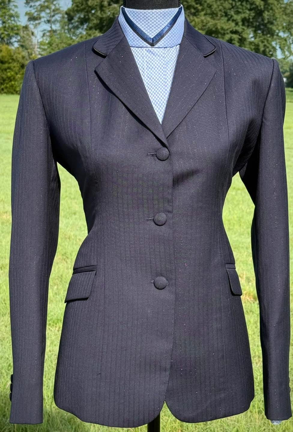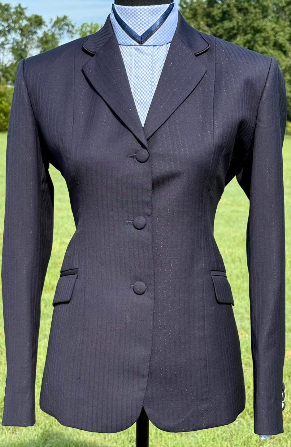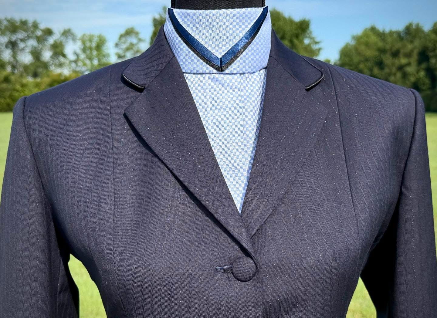 Navy Boo Yah hunt jacket with double navy/gold piping on the collar and lapel. Size 6. Please refer to size chart.