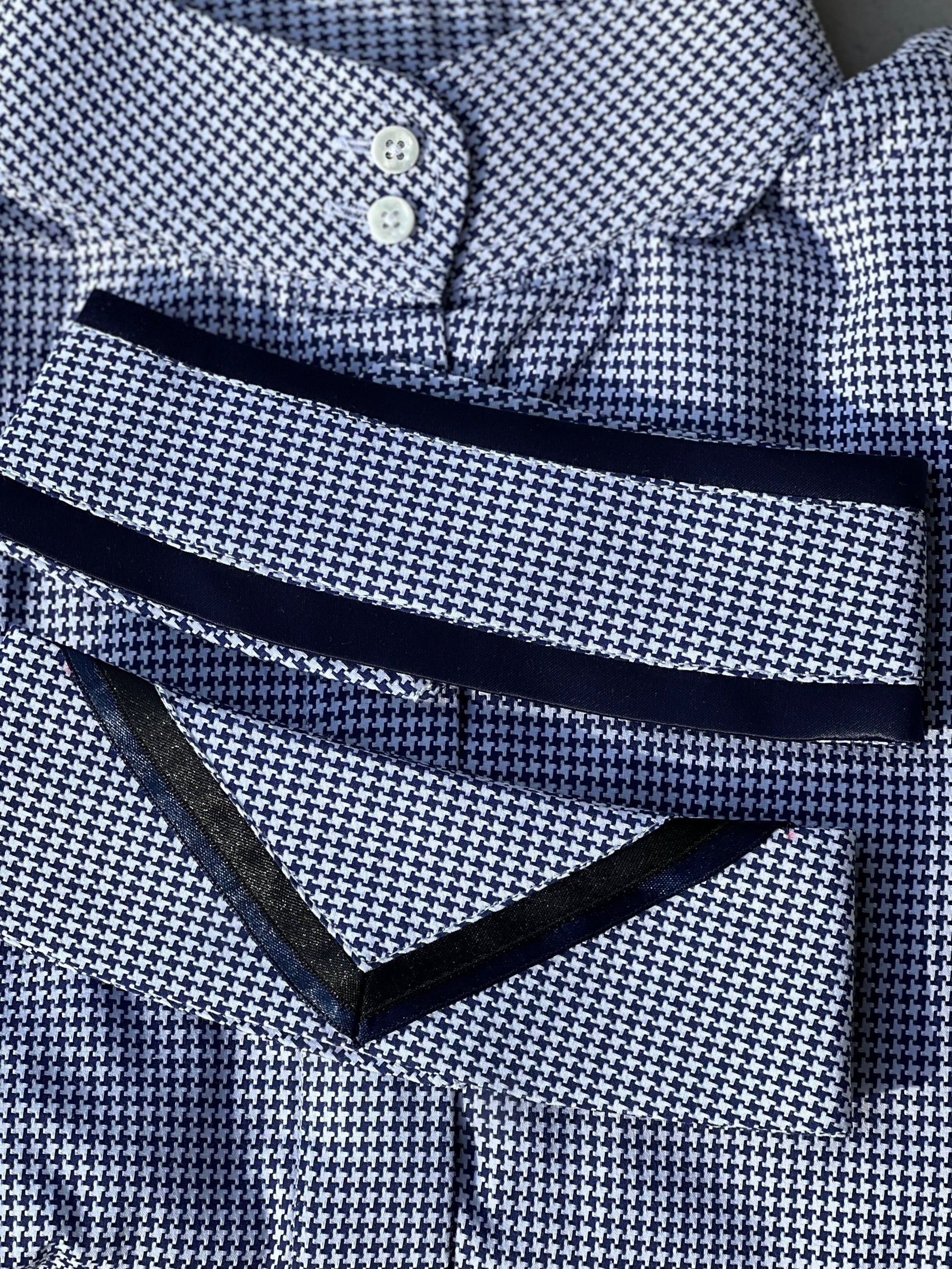 White/navy houndstooth Boo Yah hunt shirt with thick navy ribbon piping and Black thin stripe (not pictured) collars. Size 32. Please refer to size chart.