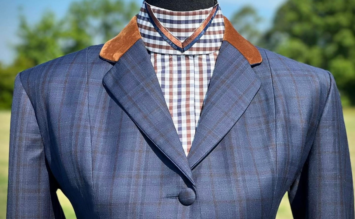 Navy and brown plaid Boo Yah hunt jacket with navy/brown double piping and velvet on the collar. Please refer to size chart.