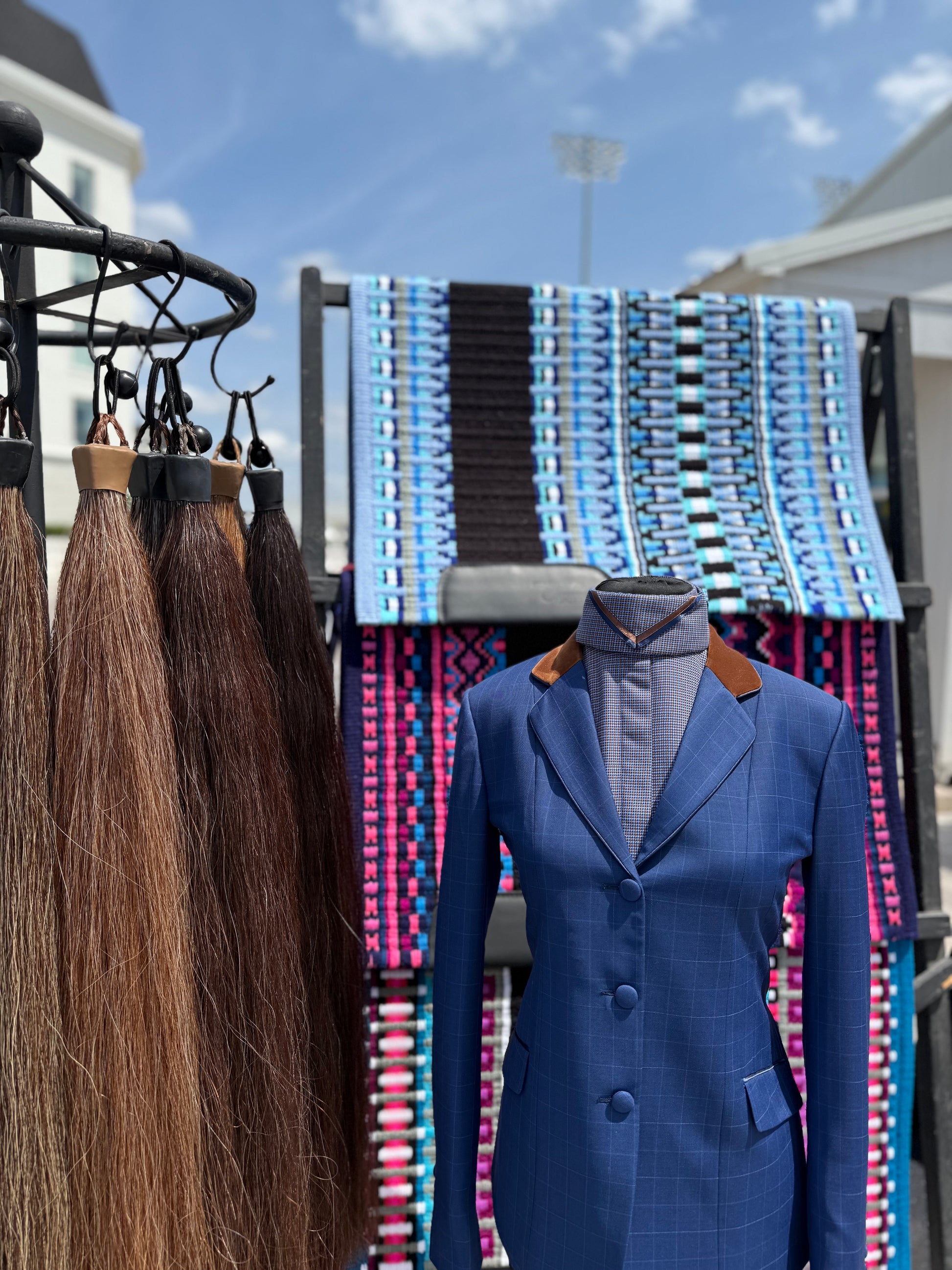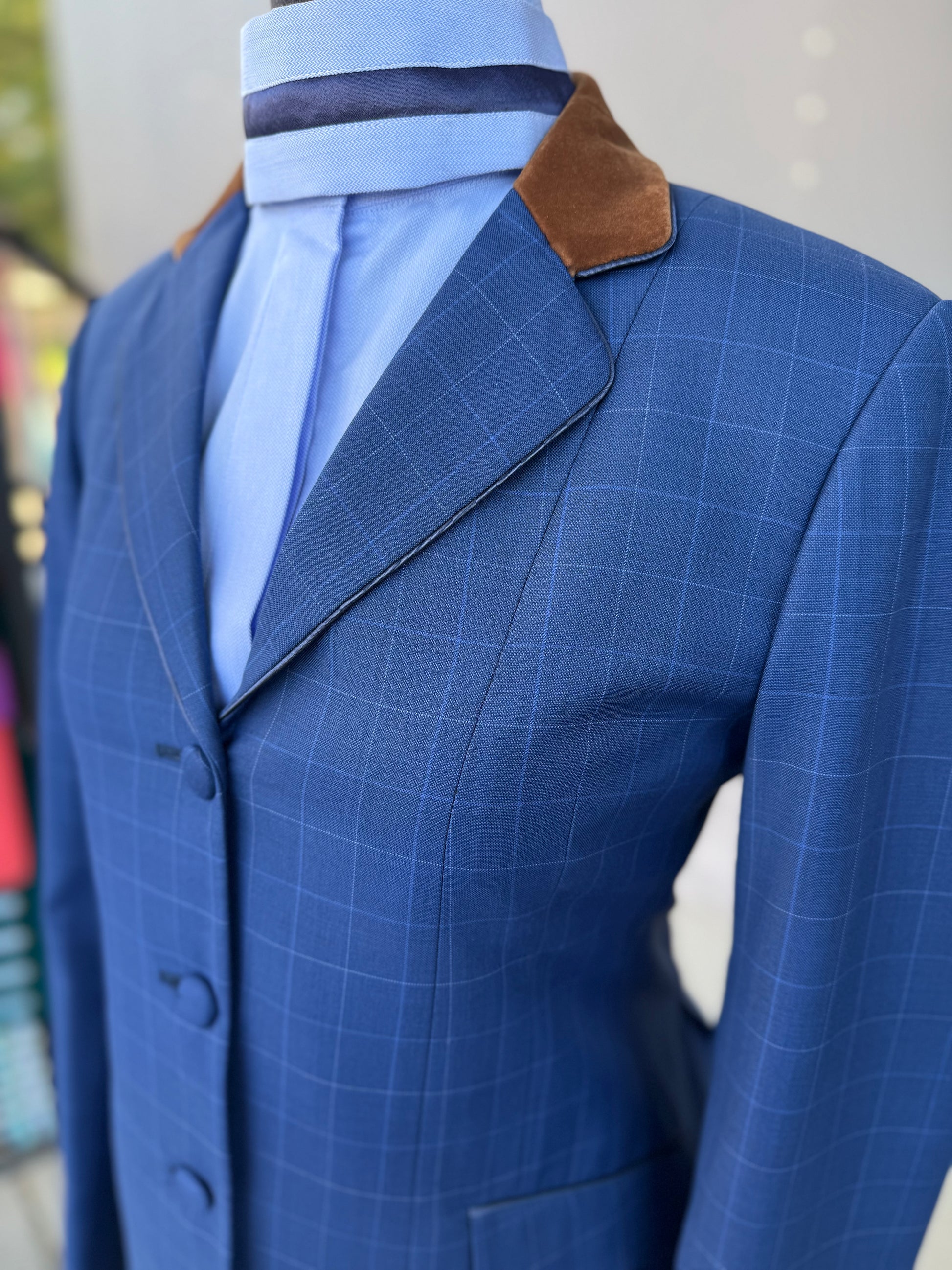 Navy Boo Yah hunt jacket with navy piping on the collar with camel velvet - Size 4. Please refer to size chart.