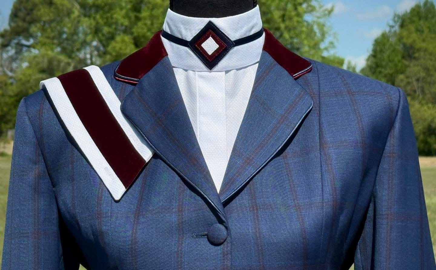White Boo Yah hunt shirt with brown paisley piping (shown on shoulder of mannequin) and navy/burgundy open diamond collars. Size 34. Please refer to size chart.