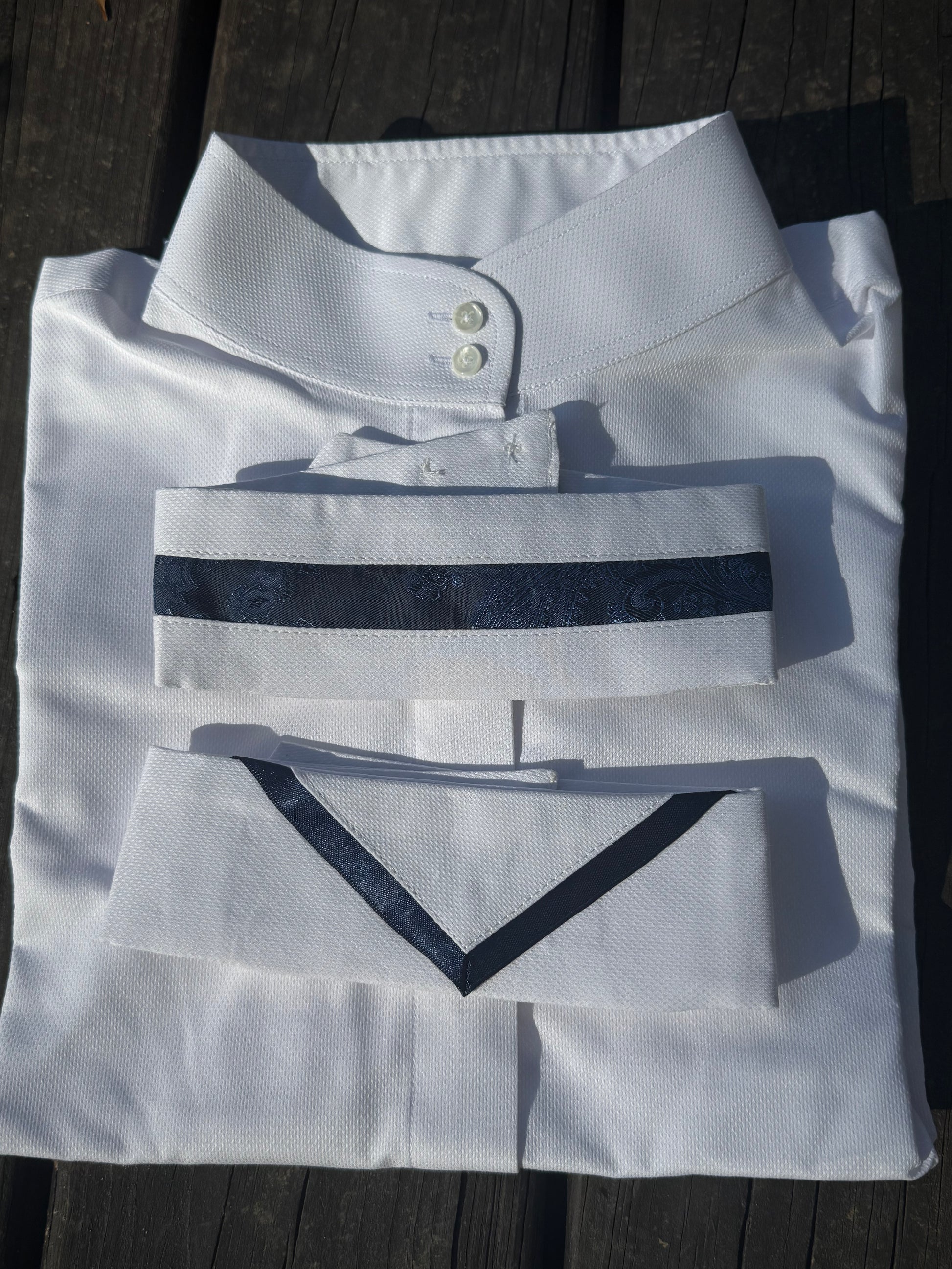 White Boo Yah hunt shirt with Navy Print Stripe and Navy V Collars. Size 38. Please refer to size chart.