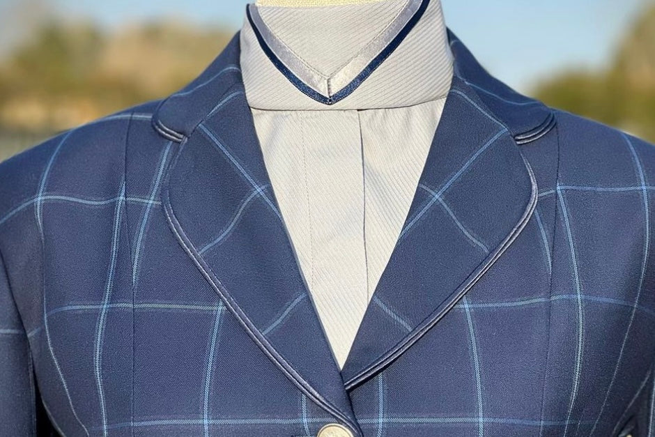 White with Medium Navy/Silver V and Thin Navy collars. Size 32. Please refer to size chart.