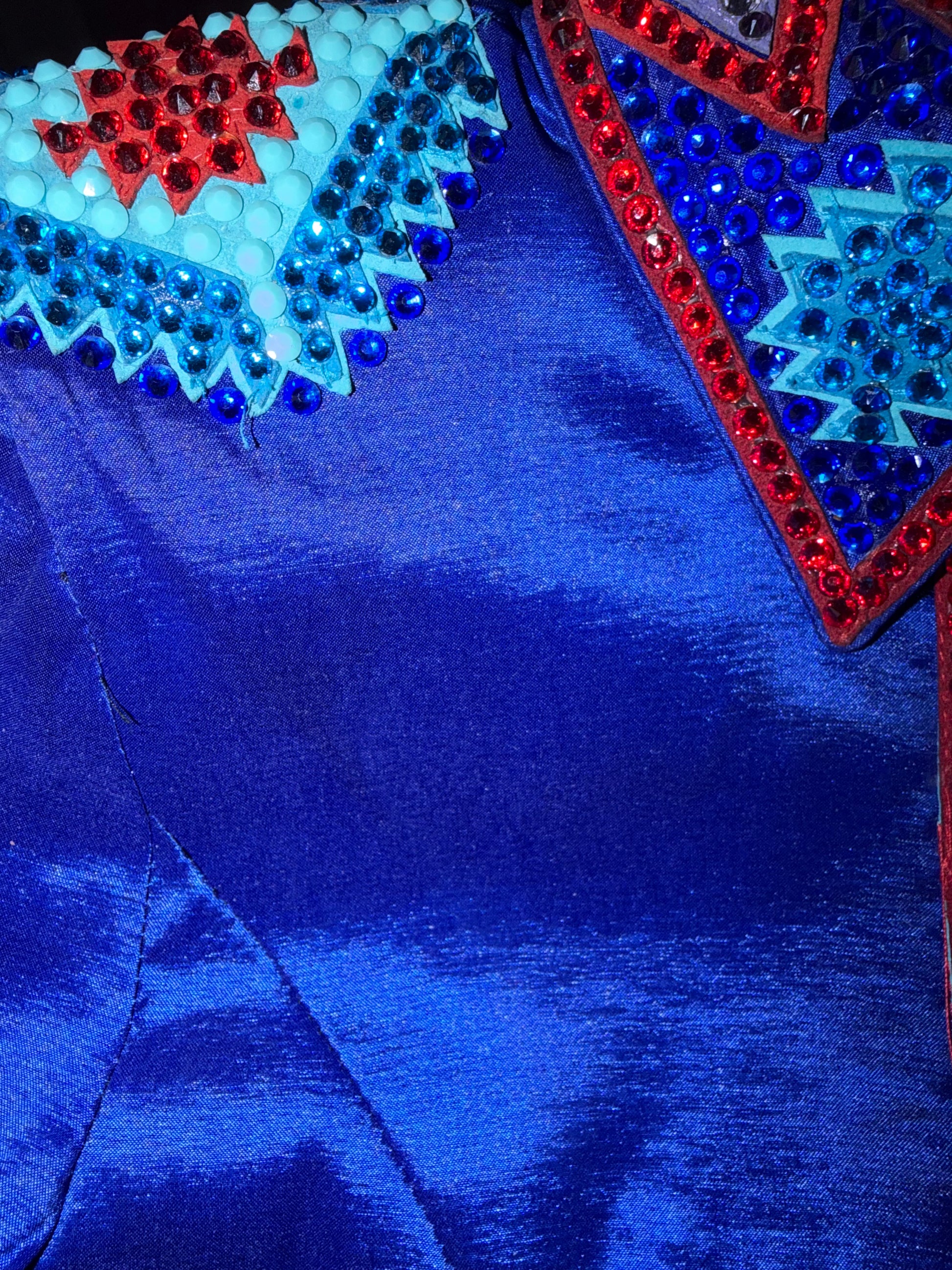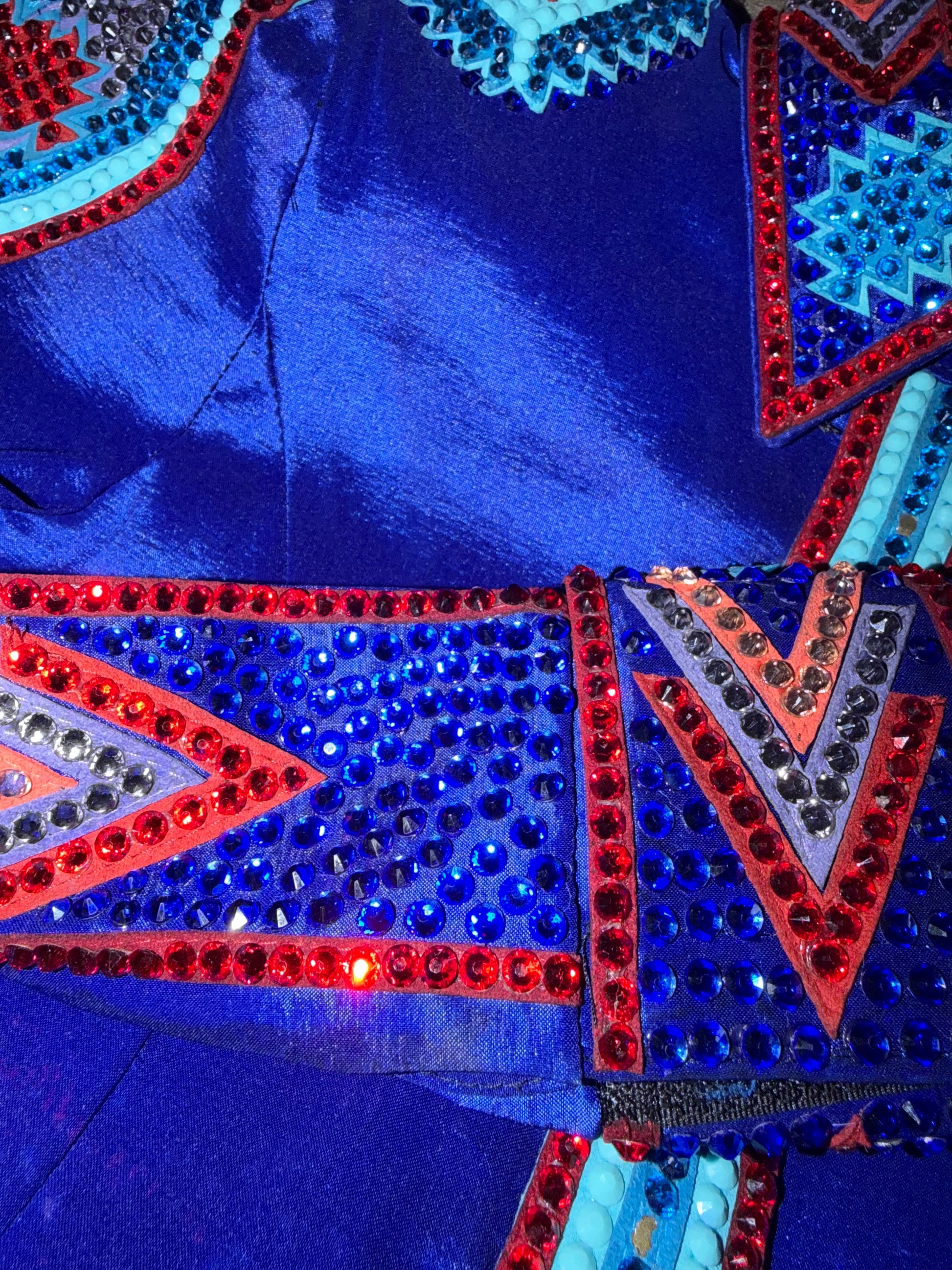 This piece is in great used condition and has room for alterations. A few missing stones that can be replaced easily. It also has a panty panel. Loaded with stones and definitely a great prices for the amount of crystals on the piece.