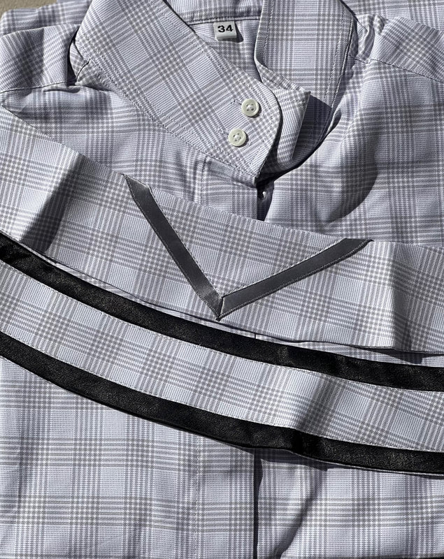 Grey and thin black stripe Boo Yah hunt shirt with thin black stripe (not pictured) and thick silver satin stripe (not pictured) collars. Size 36. Please refer to size chart.