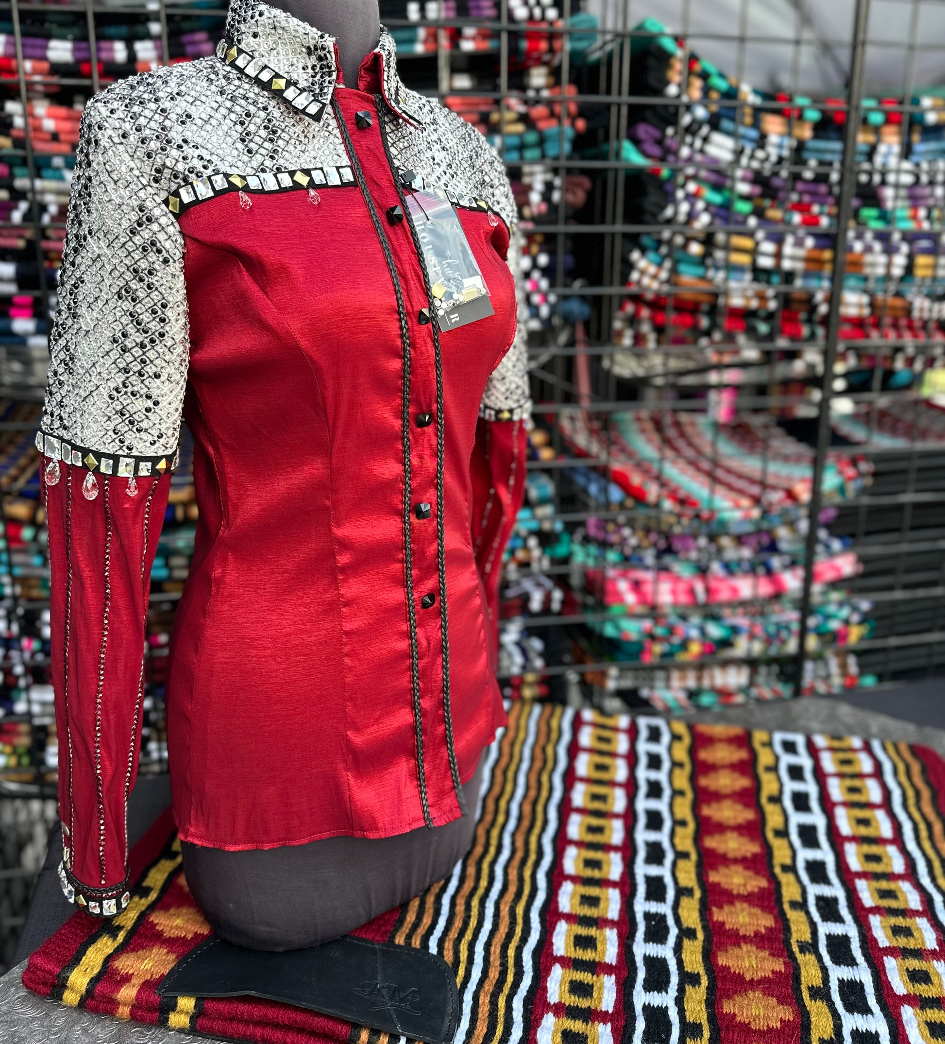 This unique piece is loaded with crystals! A super fun print that makes a classic color combo. The red is a deeper red stretch taffeta material.