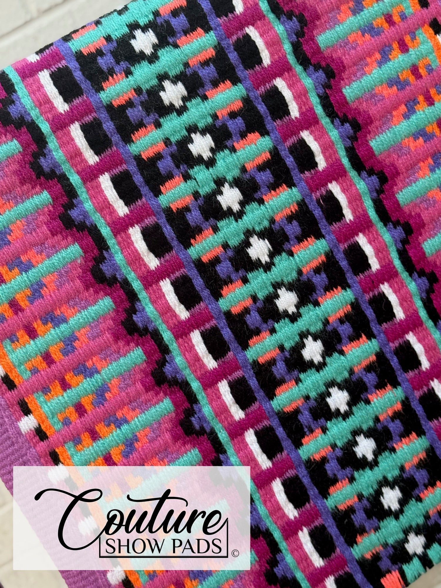 Lilac Edge; a mix of different colors: shades of purple and pink, mint, orange, coral, with black & white accents