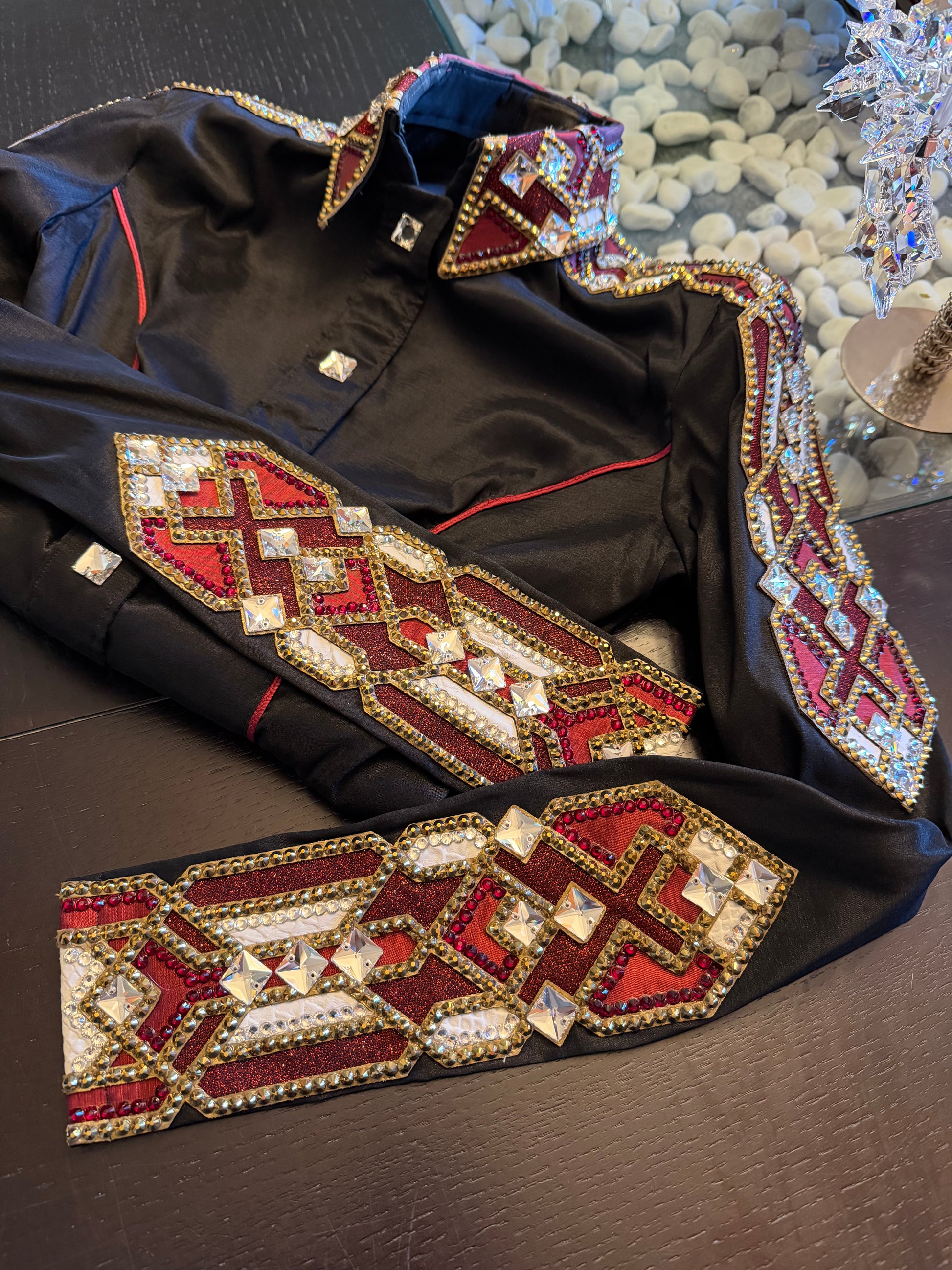 Brand new stretch taffeta day shirt - LOADED with stones and such a gorgeous pattern. Hidden zipper and beautiful princess piping seam.