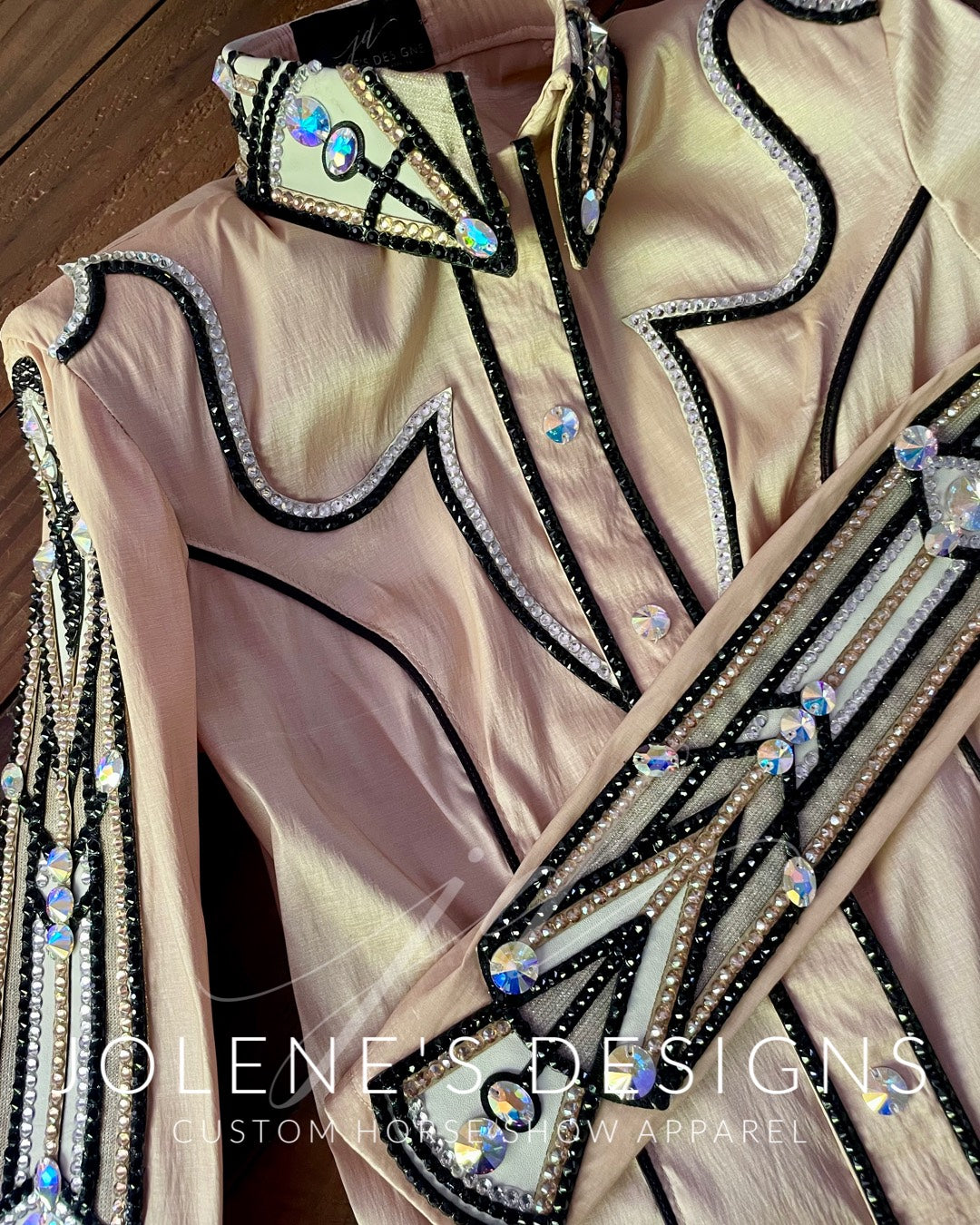 Jolene's Designs shimmering champagne day shirt with black, silver and taupe crystal accents. Crystal details up the front, across the back and down the sleeves. Approx. size medium.