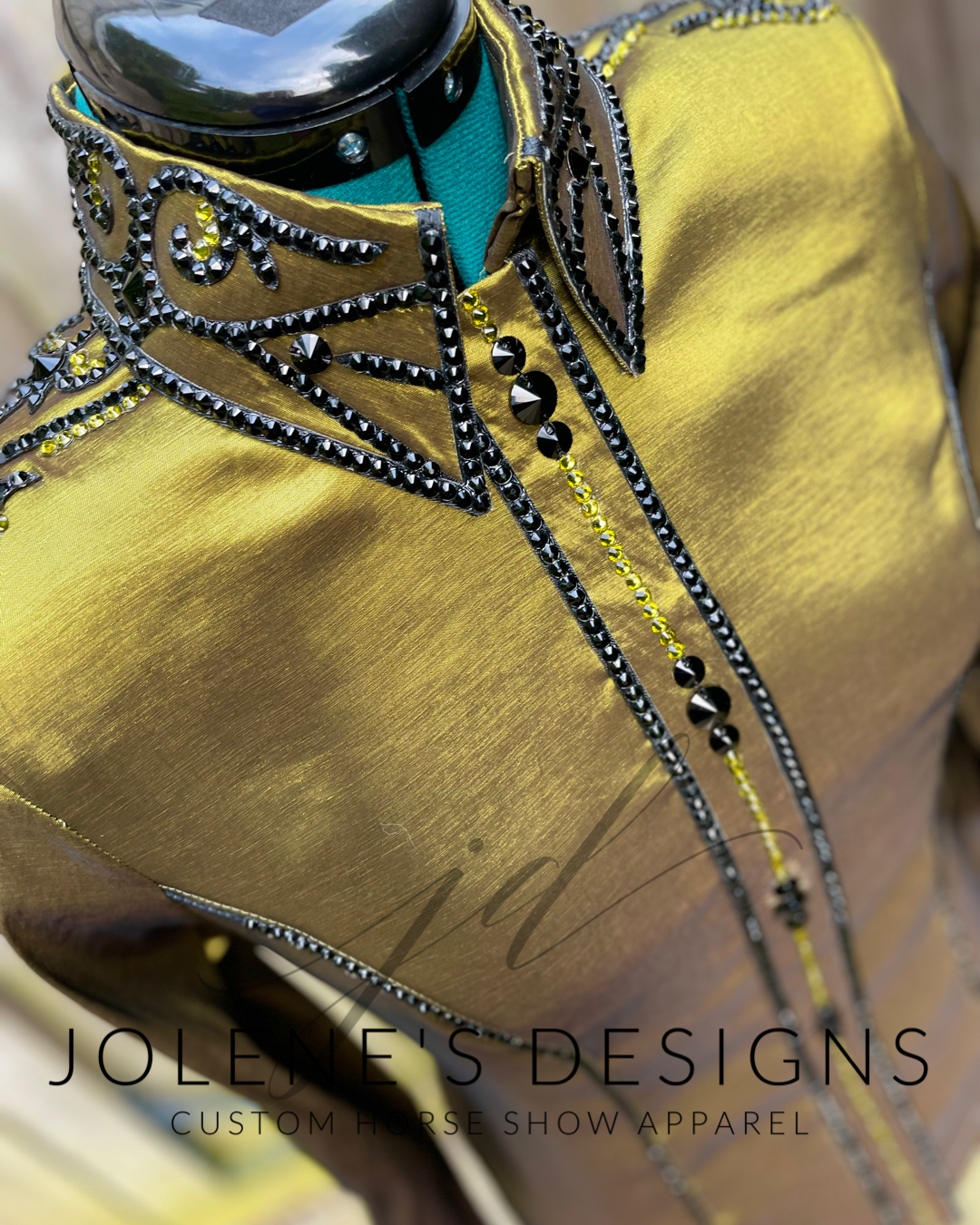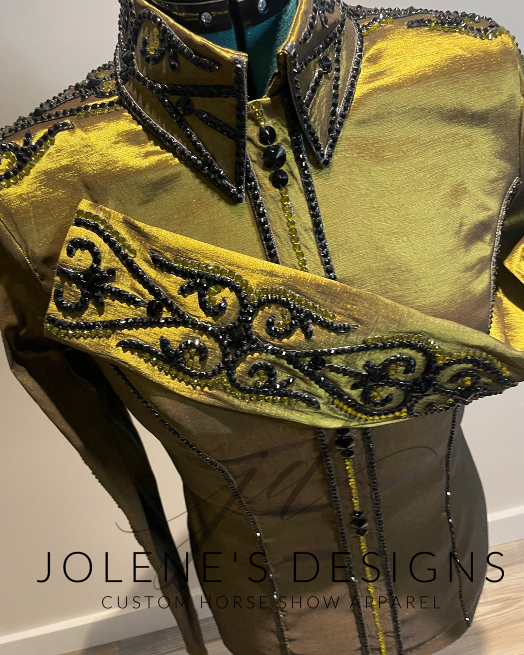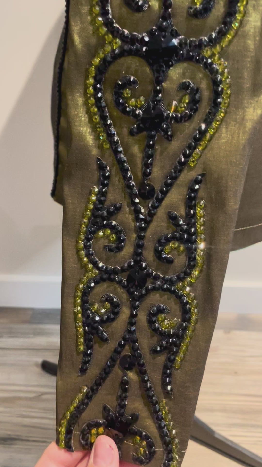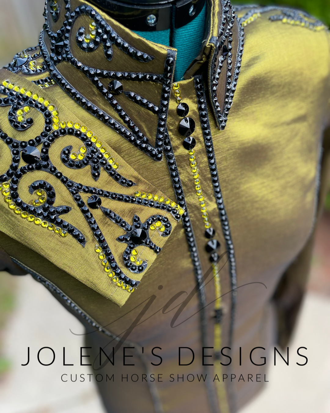 Jolene's Designs olive stretch taffeta day shirt with the prettiest sheen and elegant black crystal details up the front, across the collar, and down the arms. You MUST see this one in person! It would look great on any horse and rider. Approx. size large.
