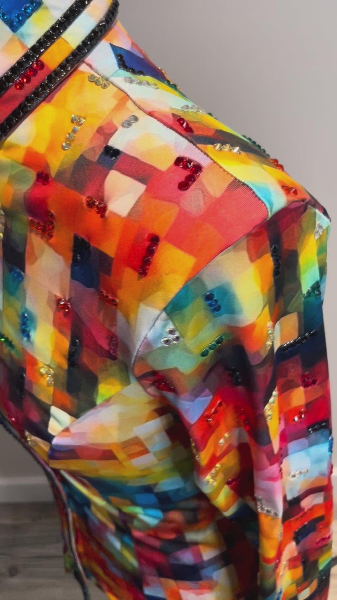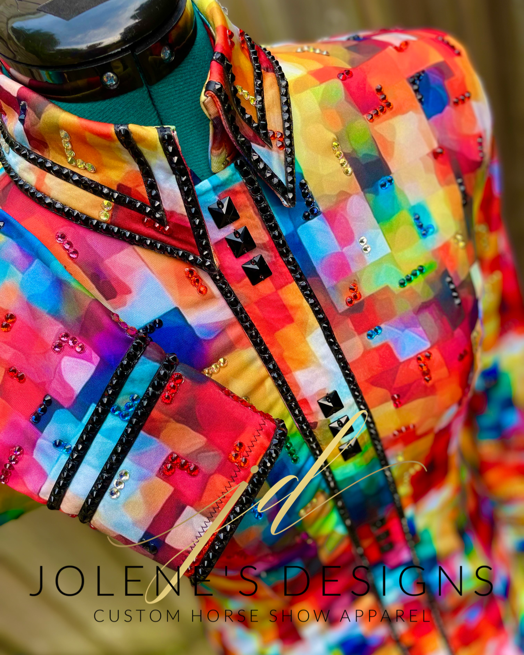 Jolene's Designs rainbow squares day shirt with black details on the collar and cuffs. Approx. size small/medium.