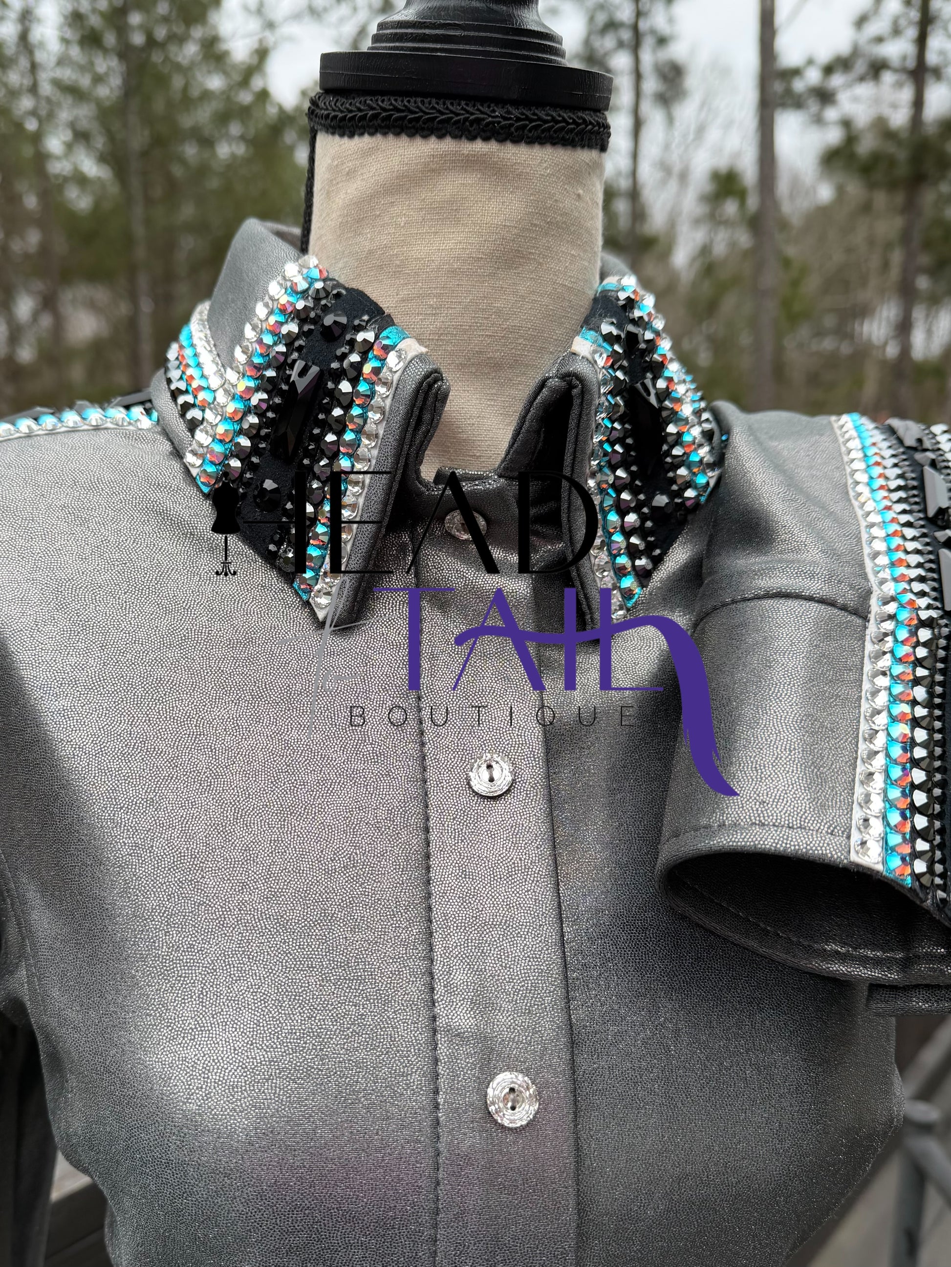 This piece was worn less than 3x. The fabric has a lot of stretch and there is room to let out or in. The broken sleeve design makes it very comfortable and without the bulge in the sleeve. LOADED with stones!