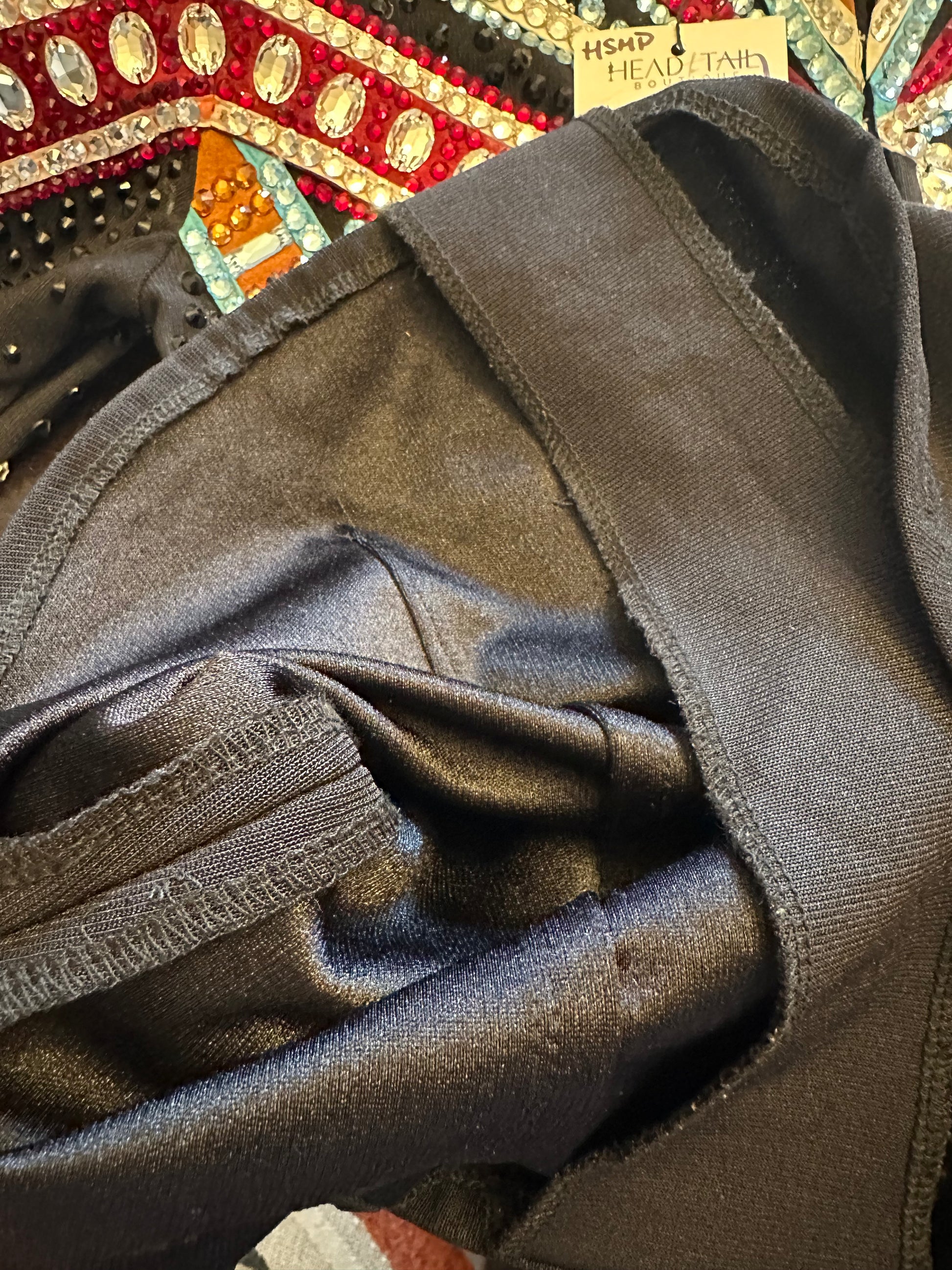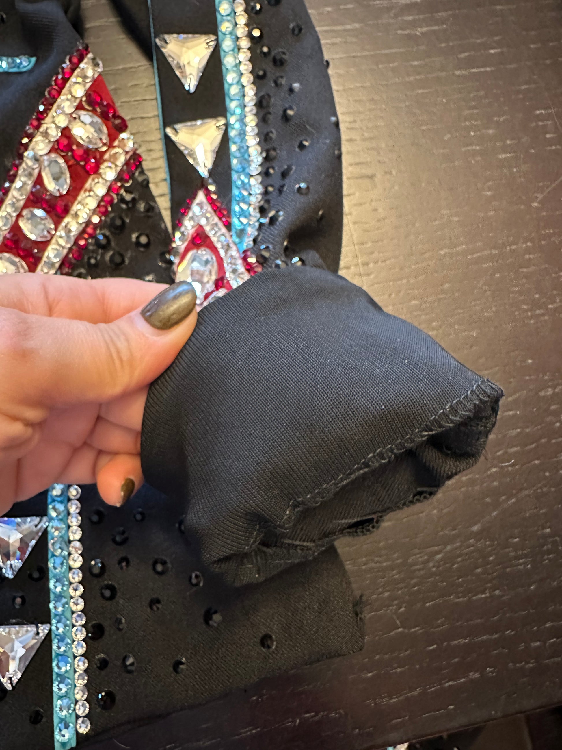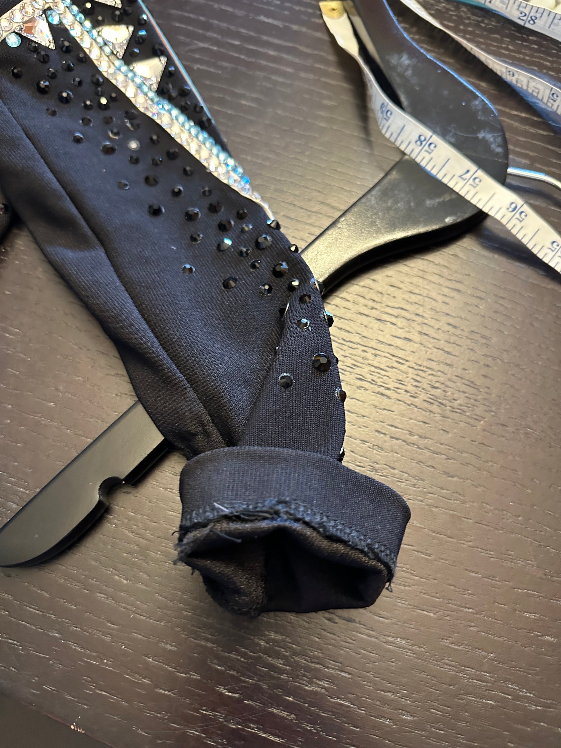 This 4 piece youth set has been taken care of by the prior owner and has a lot of love and winning left to do in it! It does have a matching pad available as well. The pieces can be taken in or let out. There are a lot of stones and sparkles! Extra snaps and hooks to help with the perfect closures for growing youth bodies. There is a lot of room to alter the arm length on these pieces too.