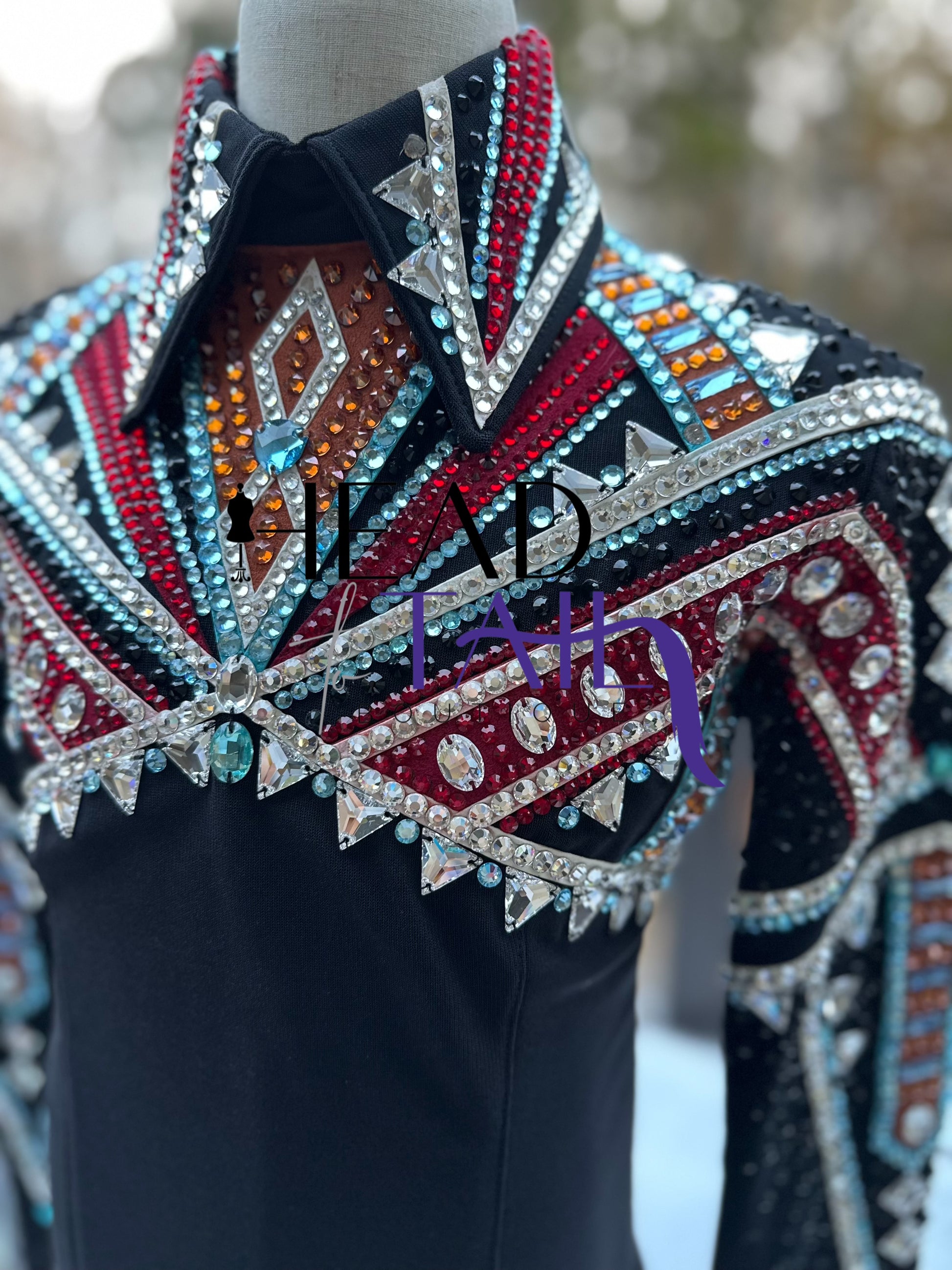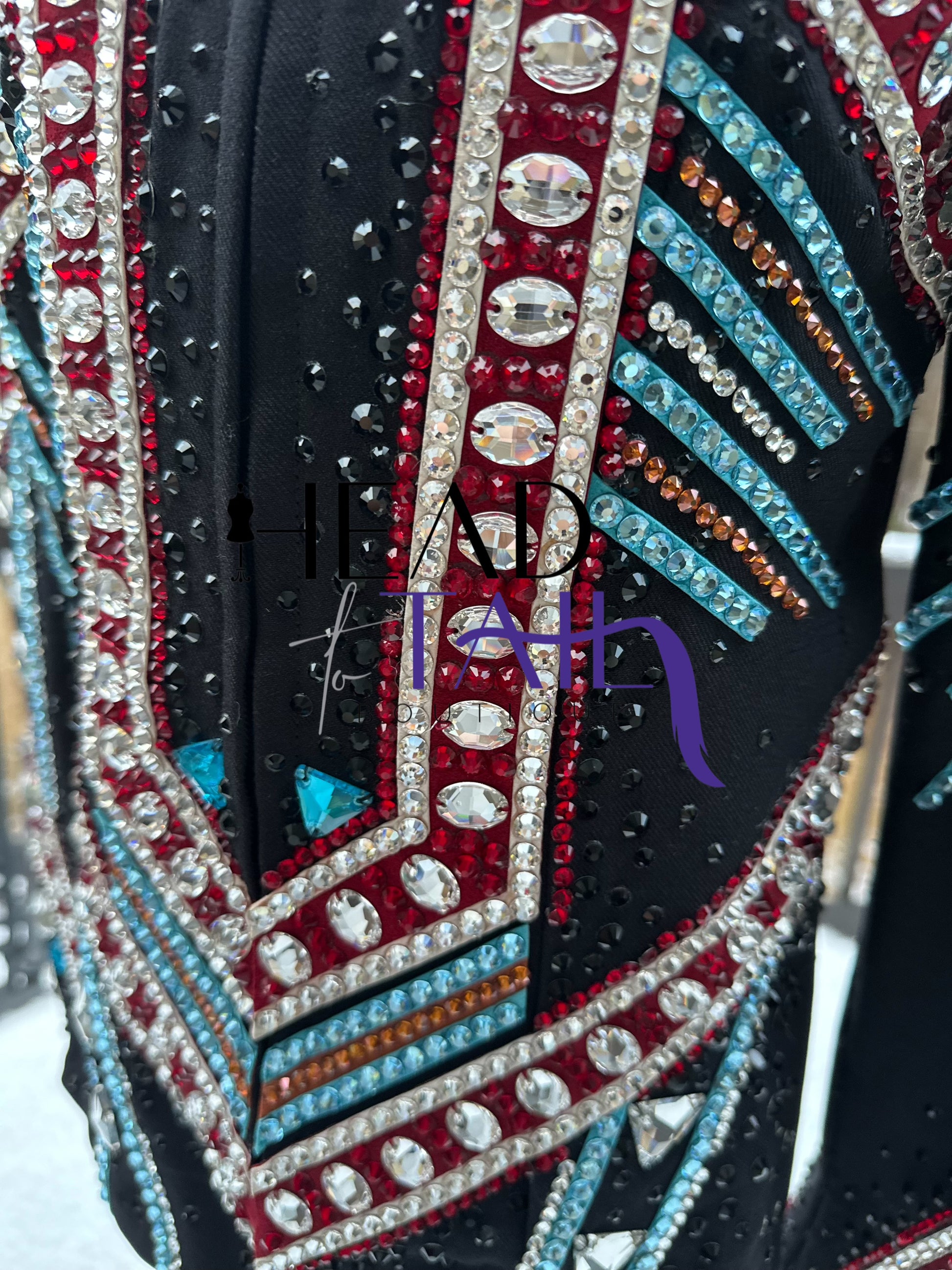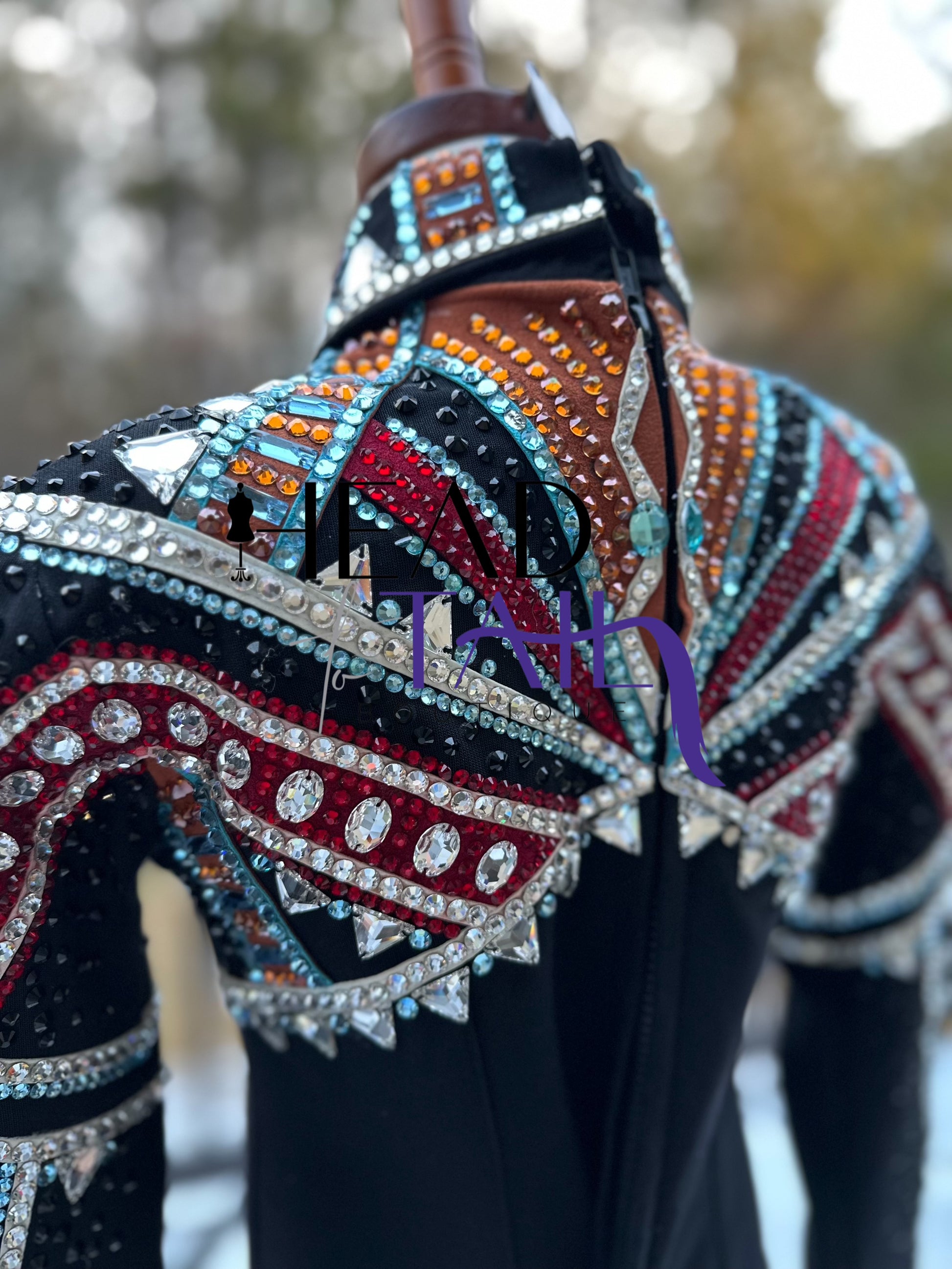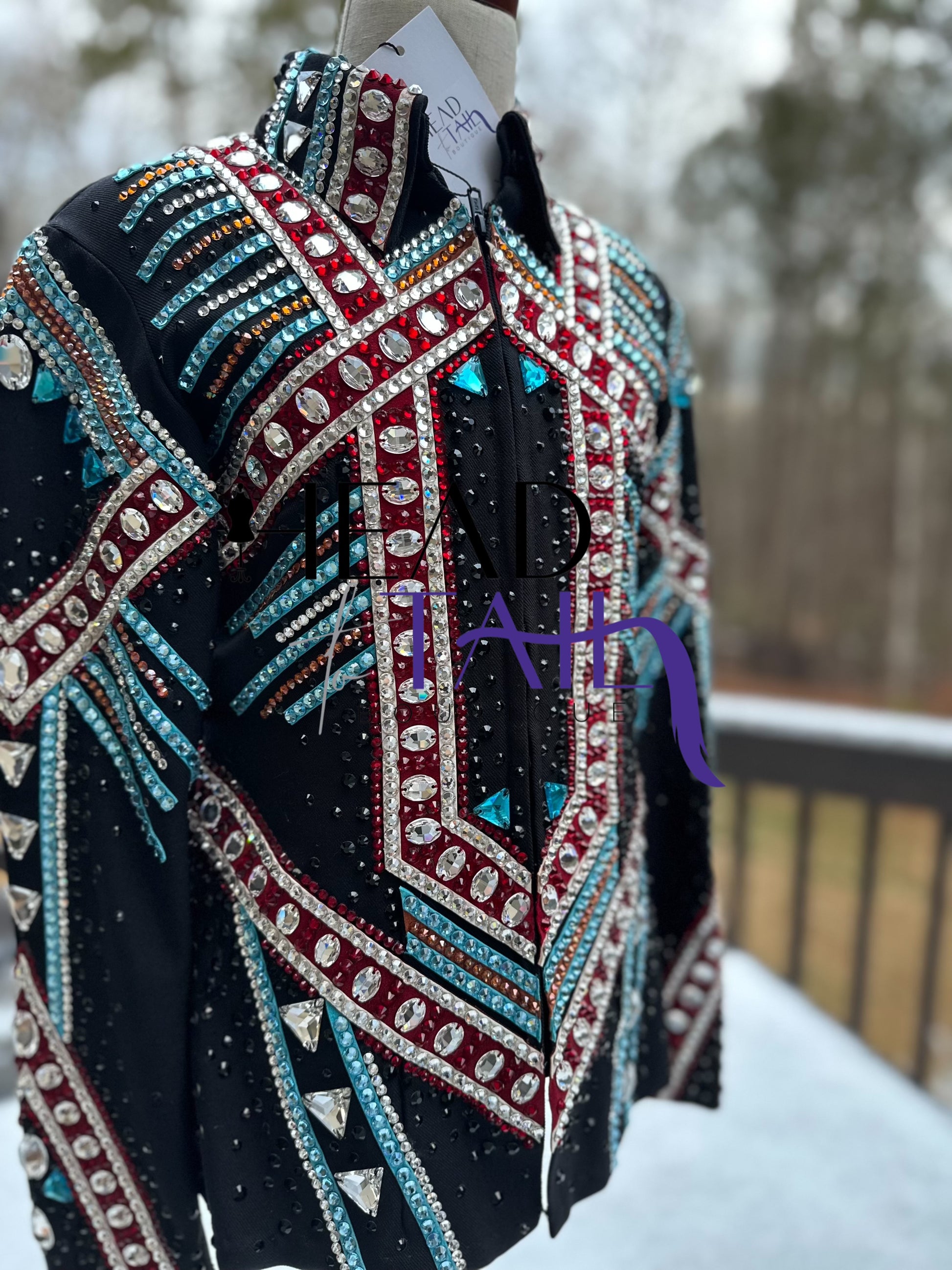 This 4 piece youth set has been taken care of by the prior owner and has a lot of love and winning left to do in it! It does have a matching pad available as well. The pieces can be taken in or let out. There are a lot of stones and sparkles! Extra snaps and hooks to help with the perfect closures for growing youth bodies. There is a lot of room to alter the arm length on these pieces too.