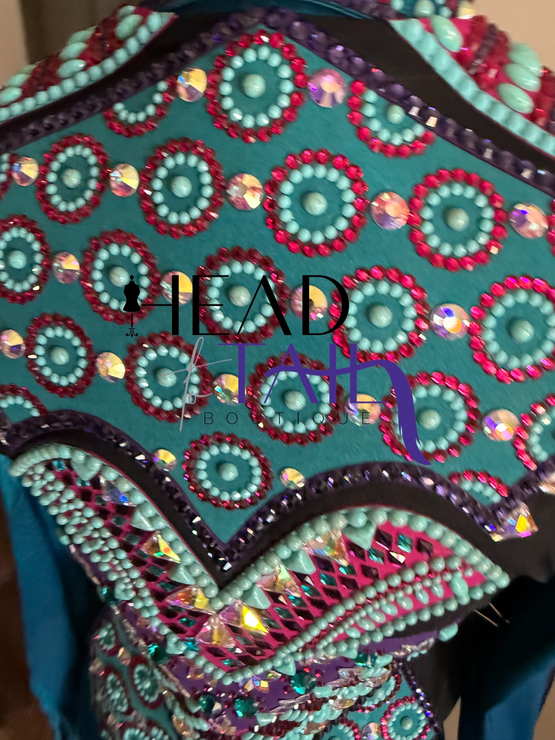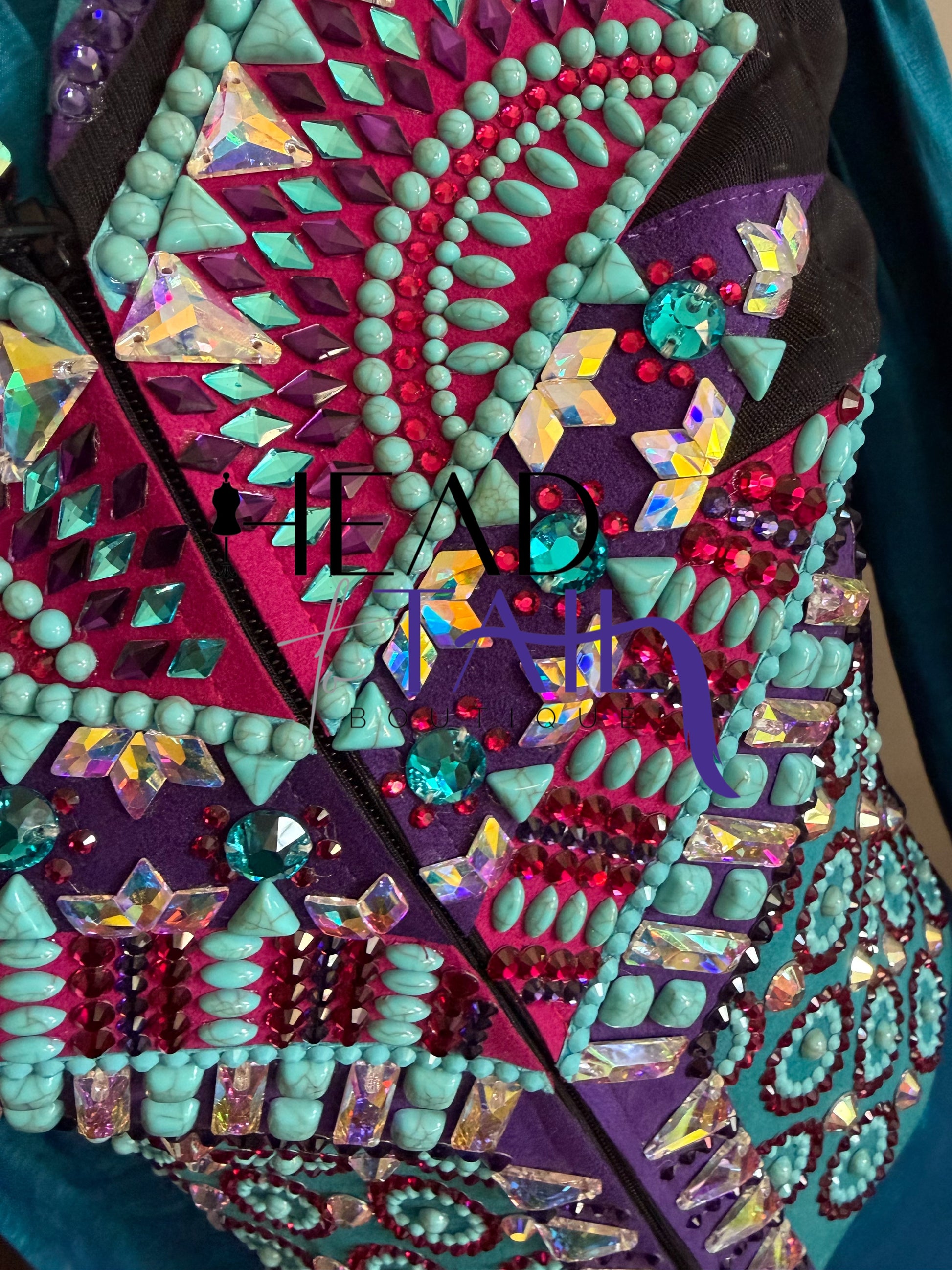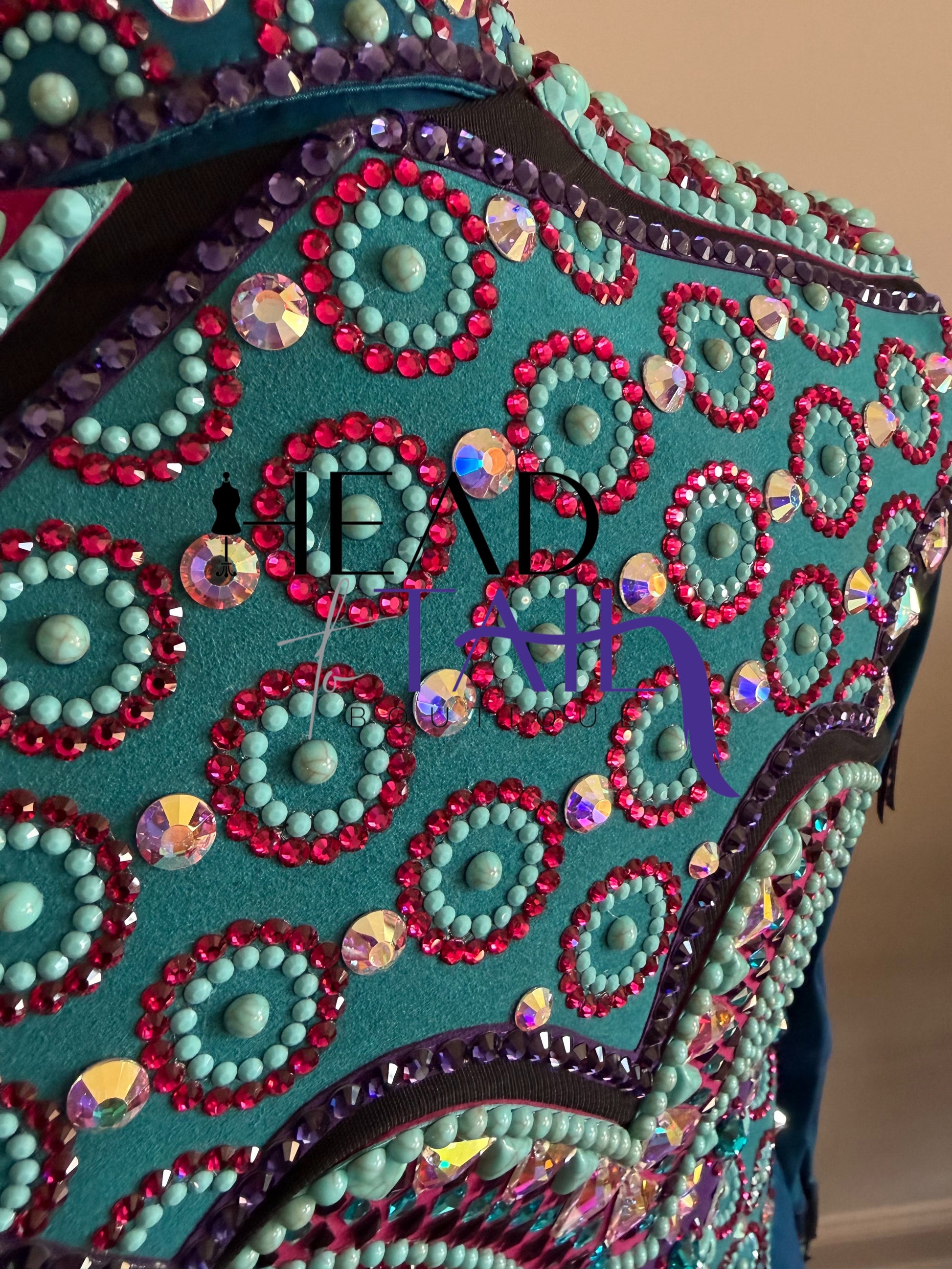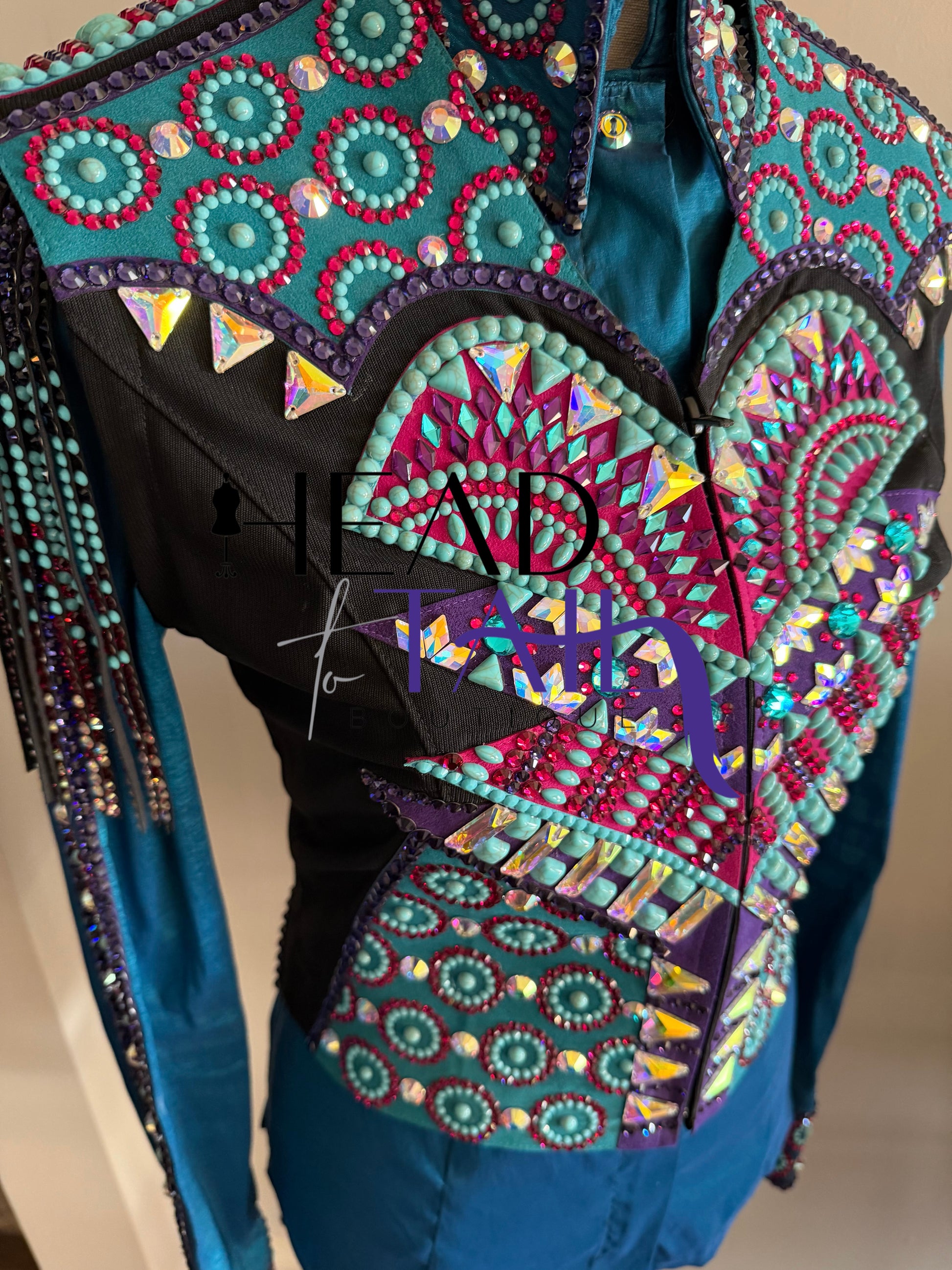 This piece was worn one time as it was made custom for the current owner. The fabric has a lot of stretch! LOADED with details and stone work - a true art piece. Removable fringe.