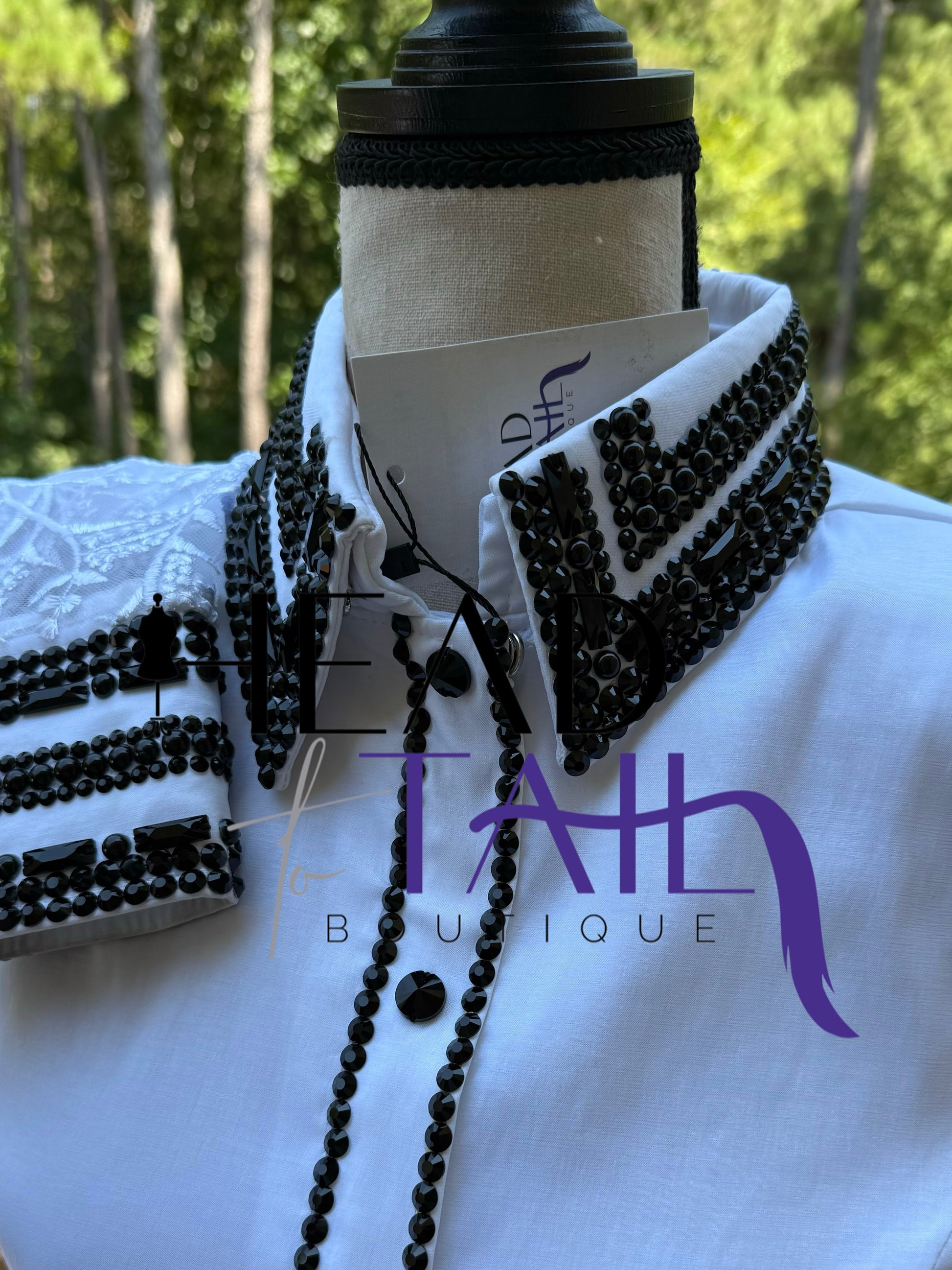 Worn a handful of times with no missing stones. The taffeta material has stretch and can be taken in or out. Initially this shirt was a larger size and was taken in.