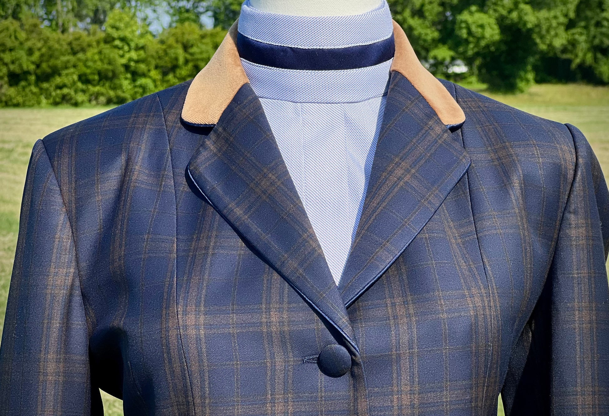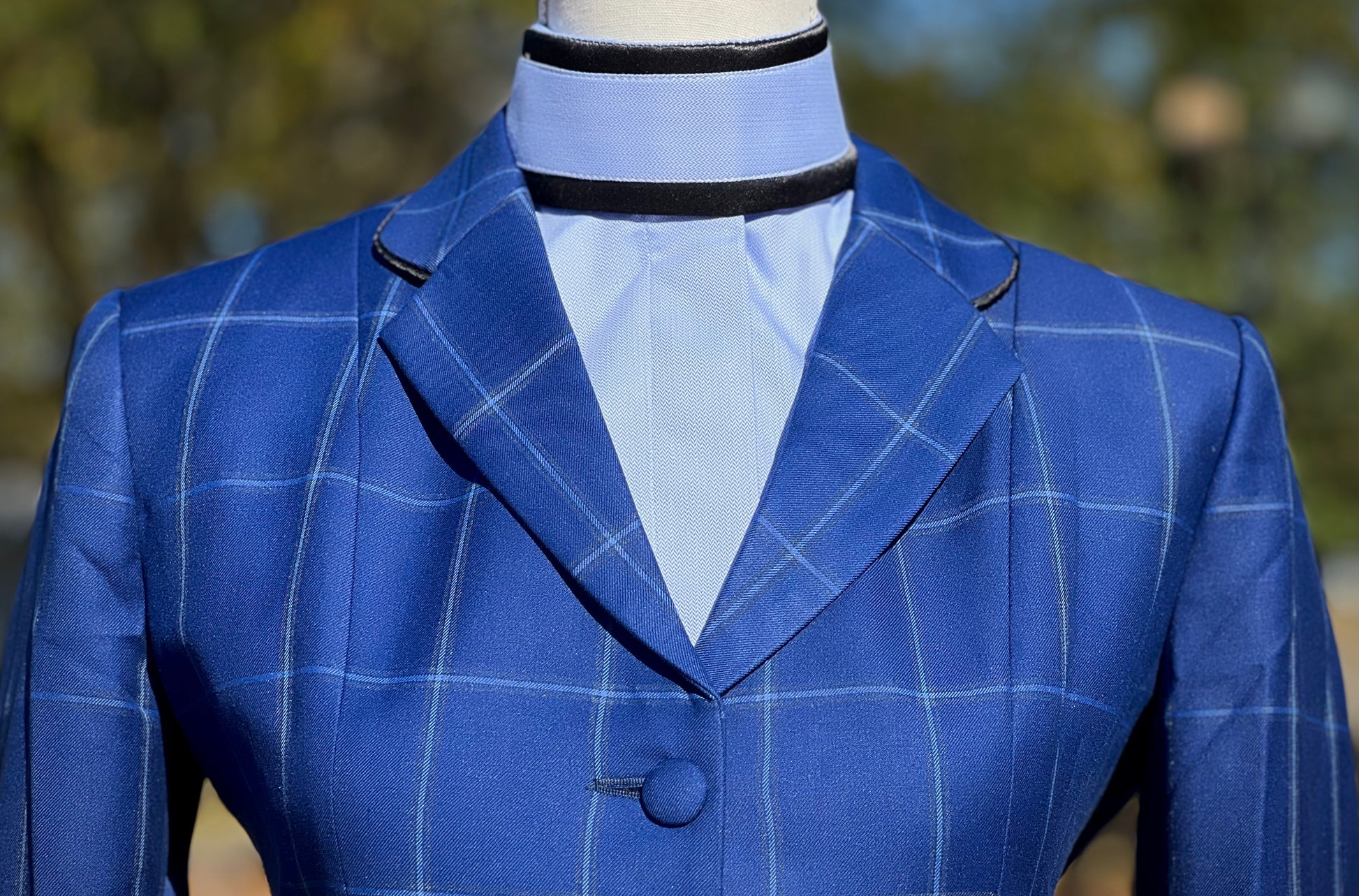 Light blue Boo Yah hunt shirt with thick navy ribbon stripe and thick black ribbon piping. Size 32. Please refer to size chart.