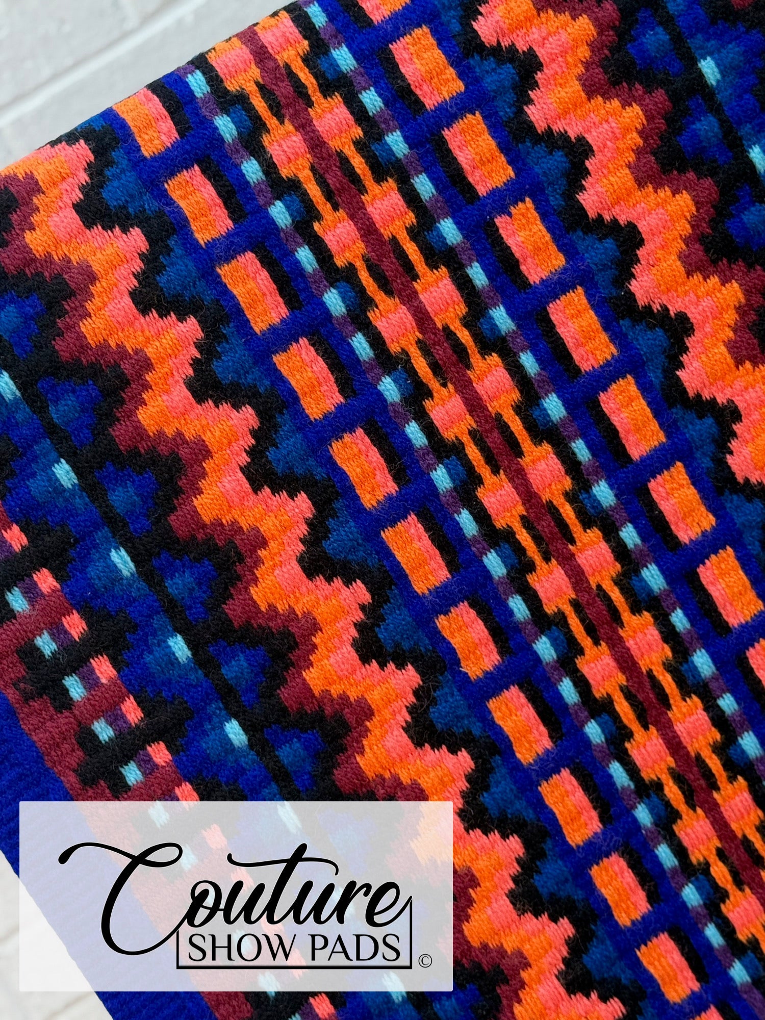 Blue Edge; a mix of different colors: shades of blue and orange, purple, burgundy, coral, turquoise, with black accents