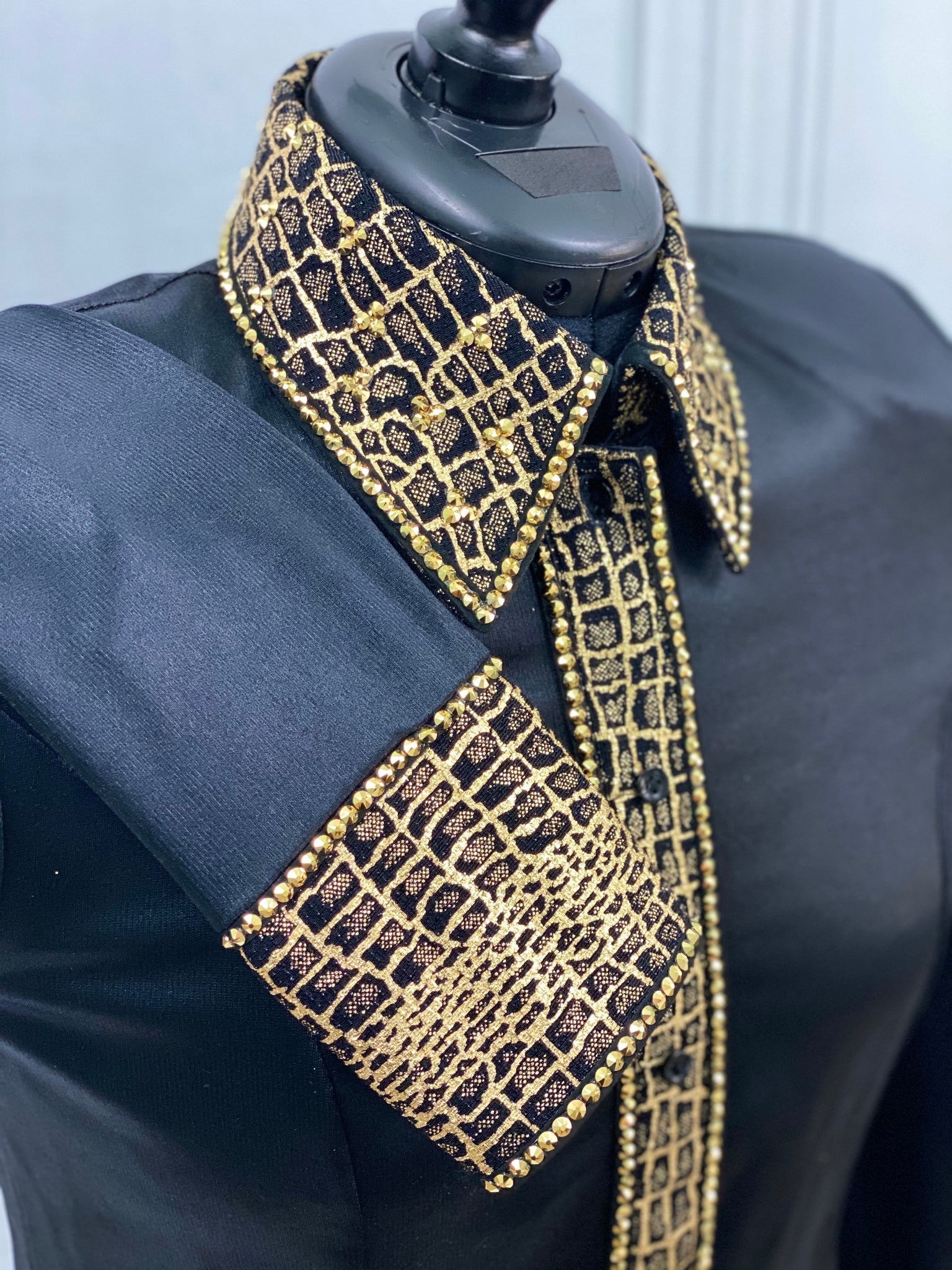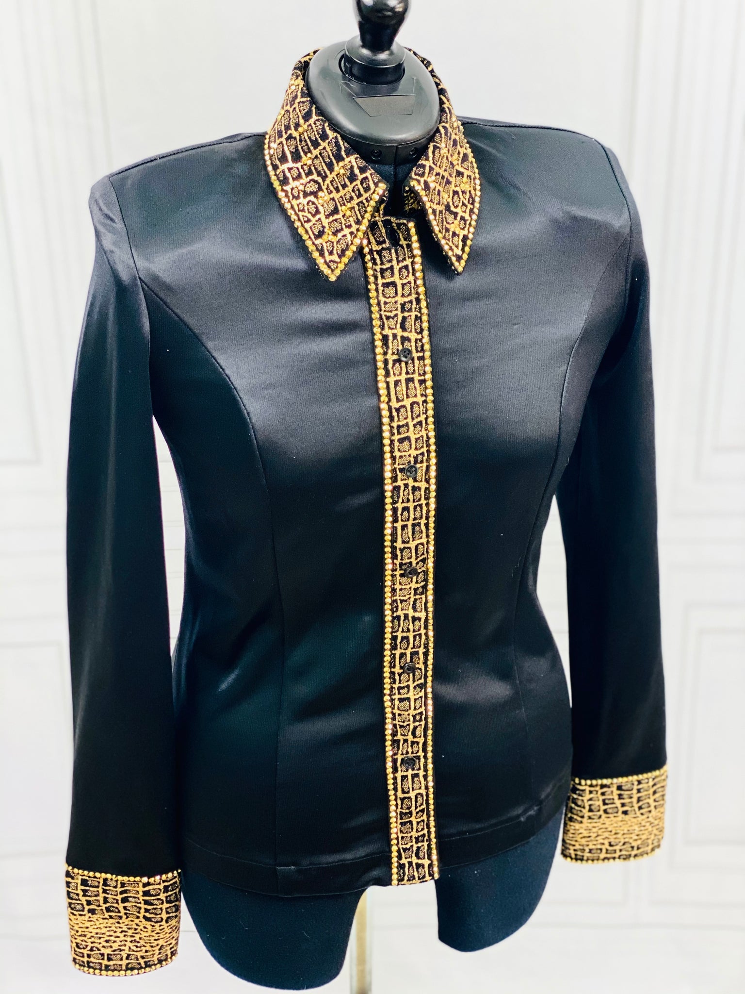 Black day shirt with gold and animal print accents. Approximate size large with room for alterations. *This item is a final sale.