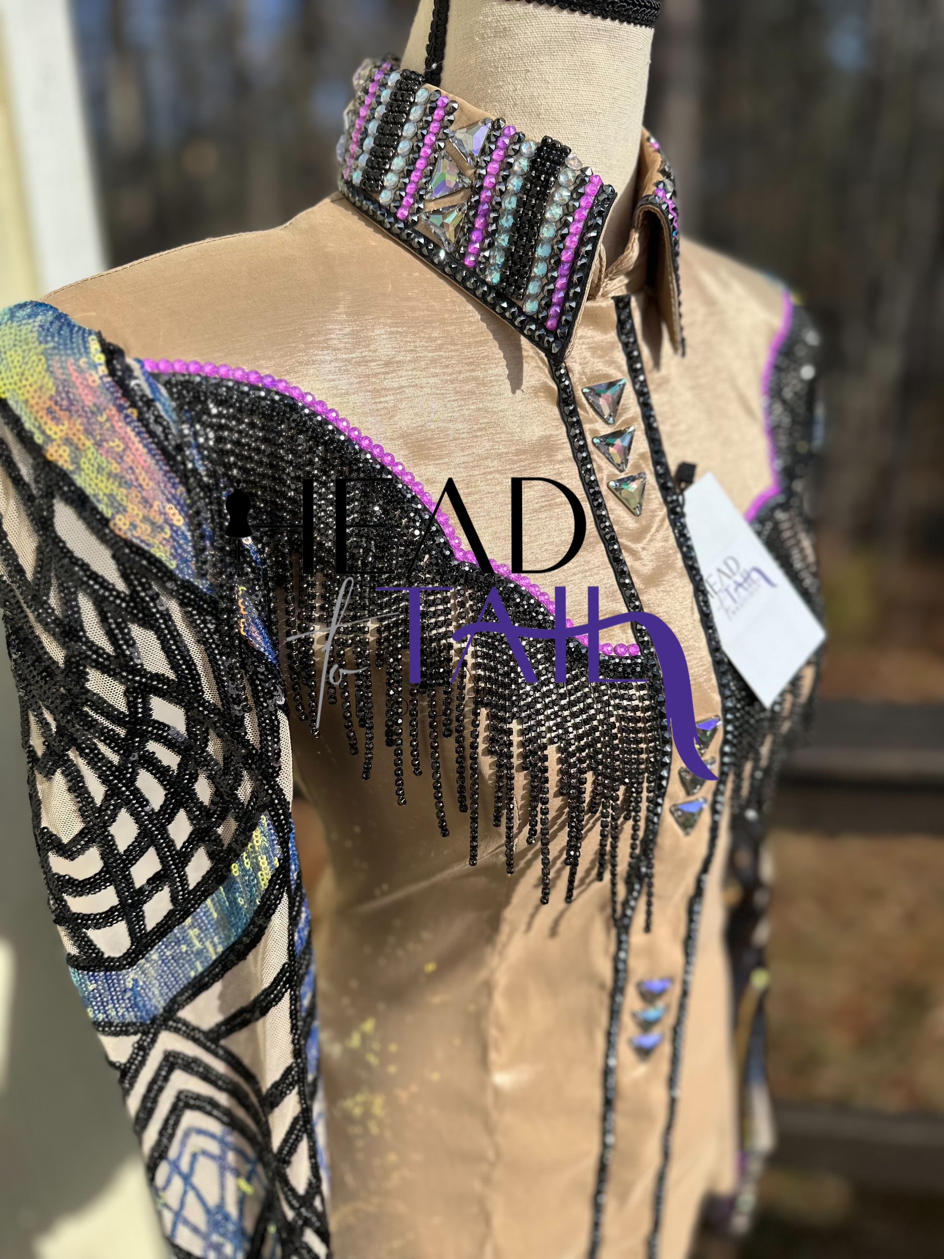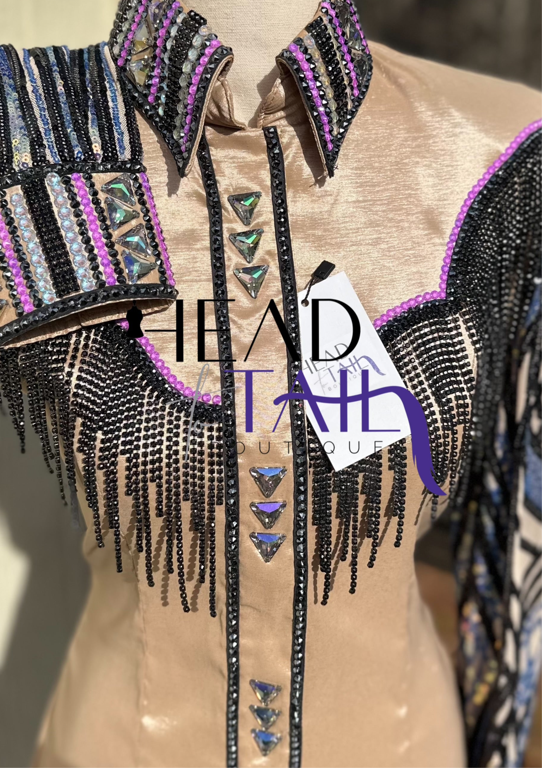 Unbridled Couture Champagne w/ Black Fringe Yoke & Purple Multi Sequins - Medium - FINAL SALE