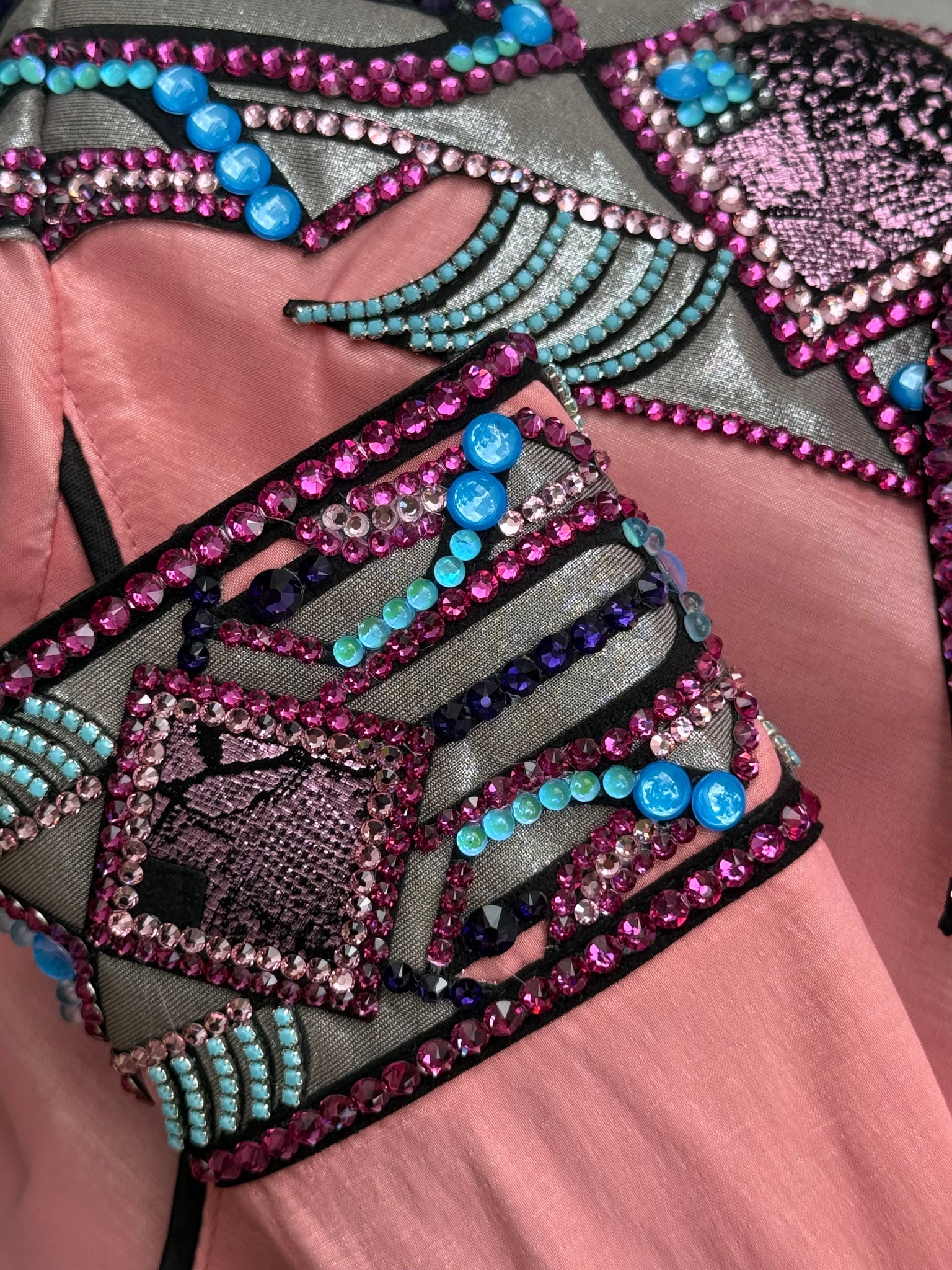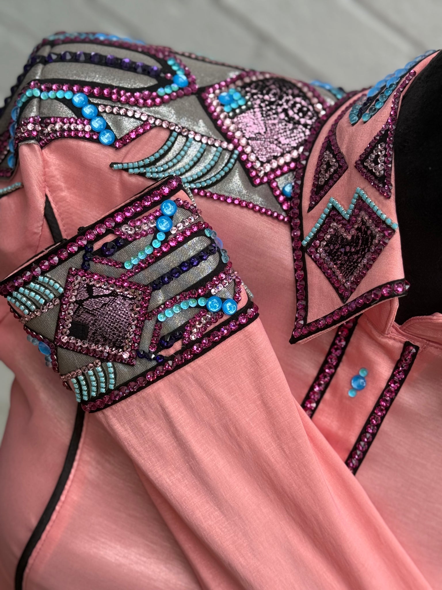 Coral Shimmer base day shirt with electric blue, fuchsia, purple, turquoise accents. Black princess seam piping. Base of shirt has stretch and can be altered up or down.