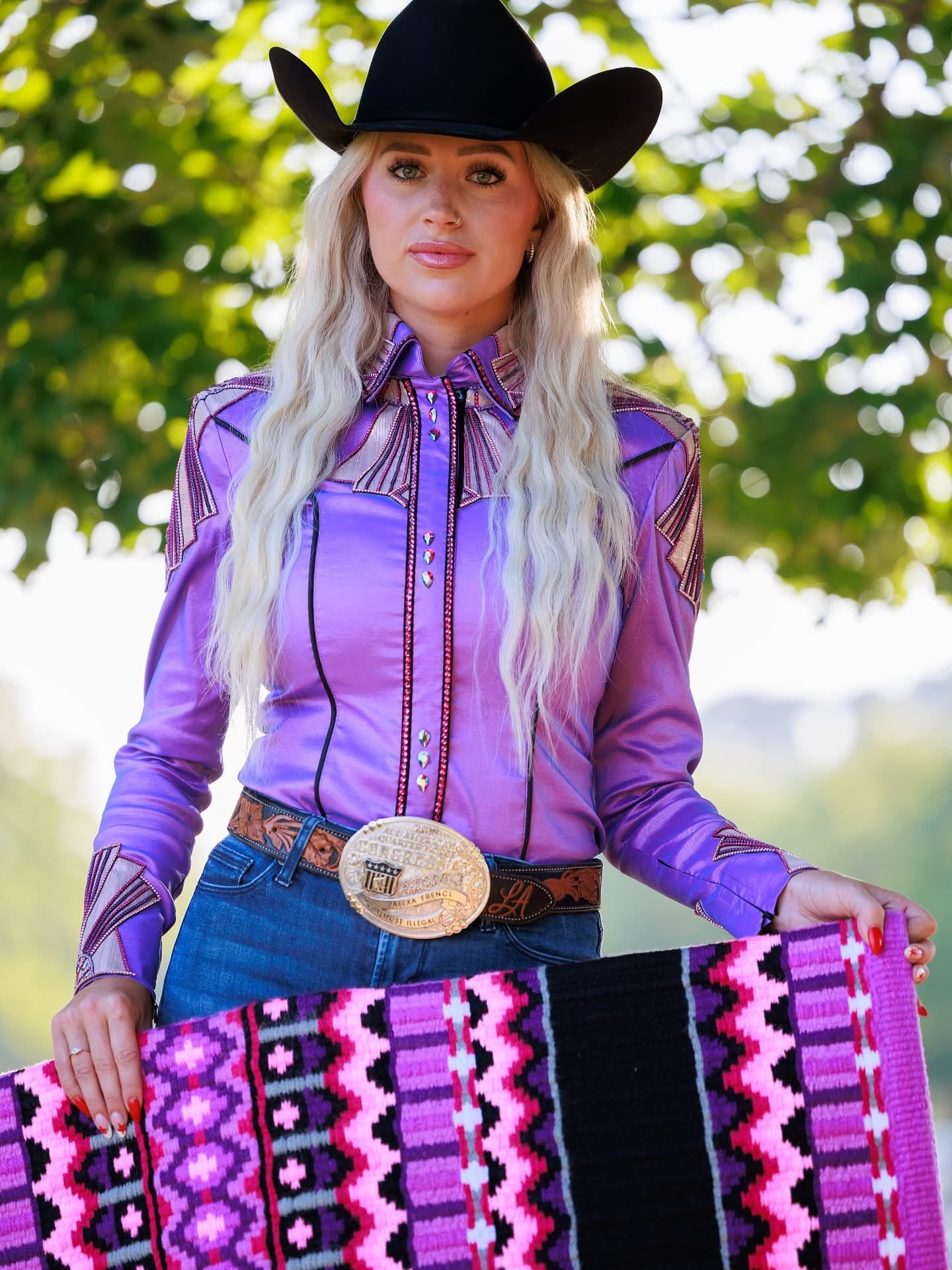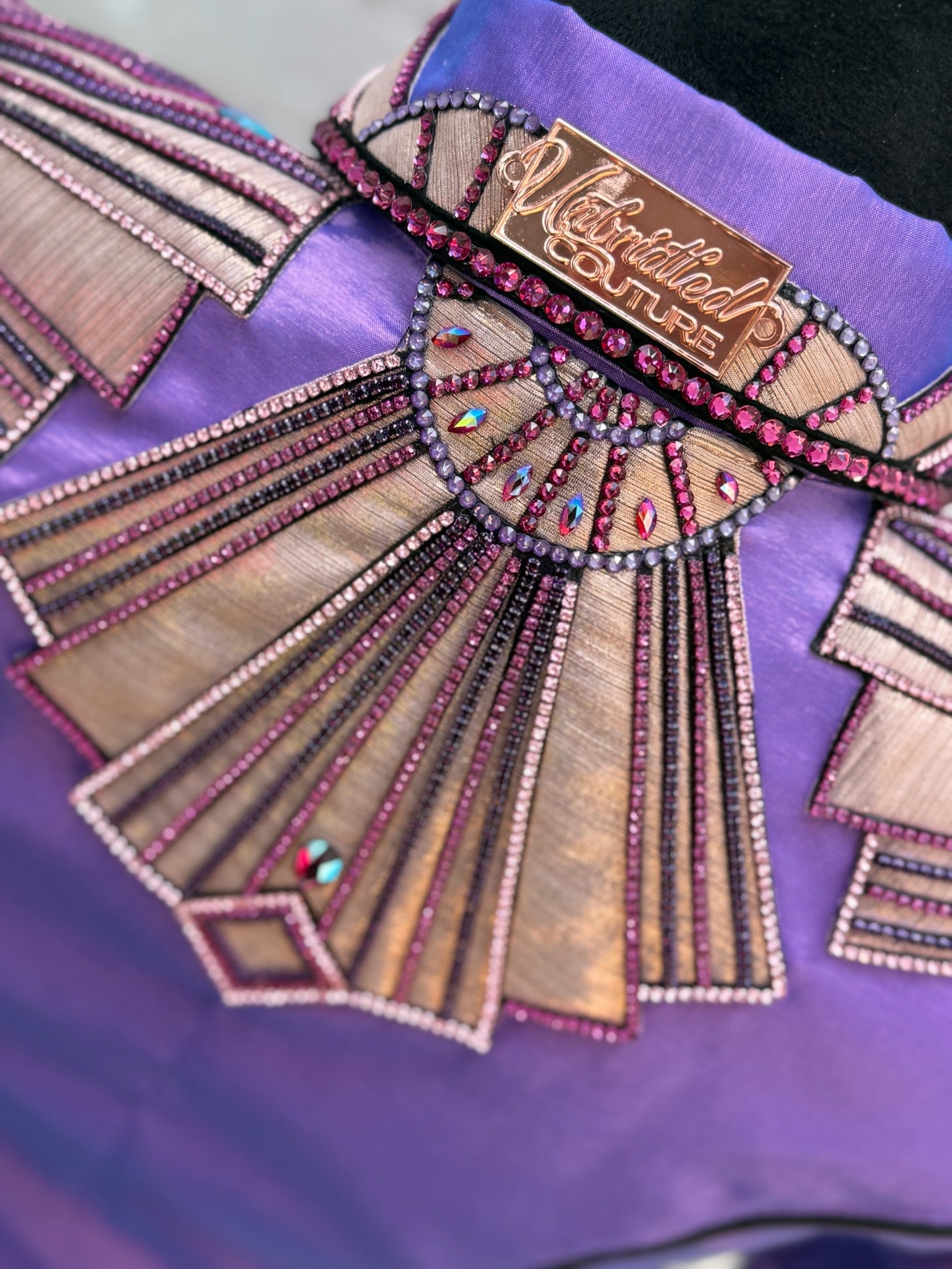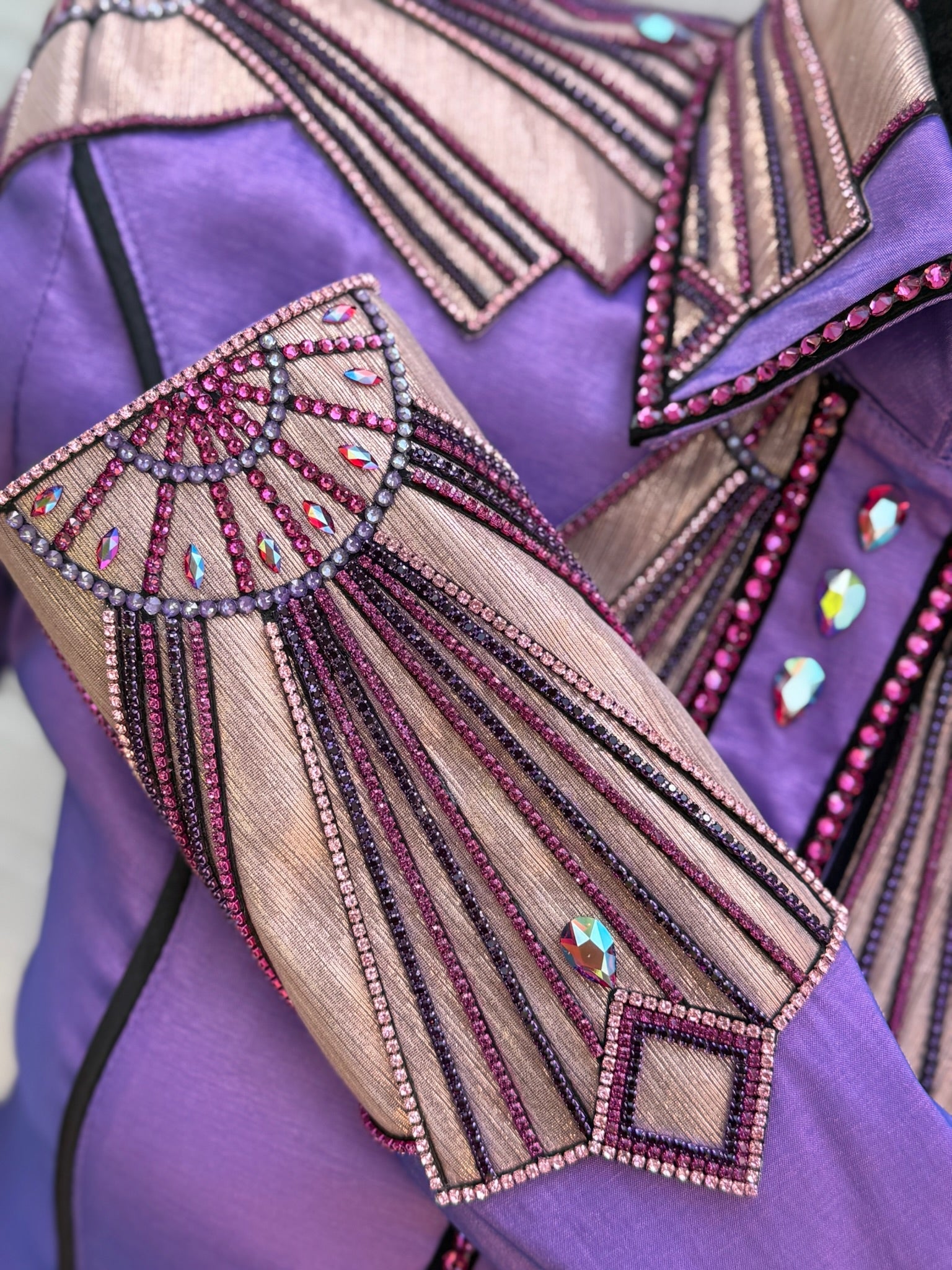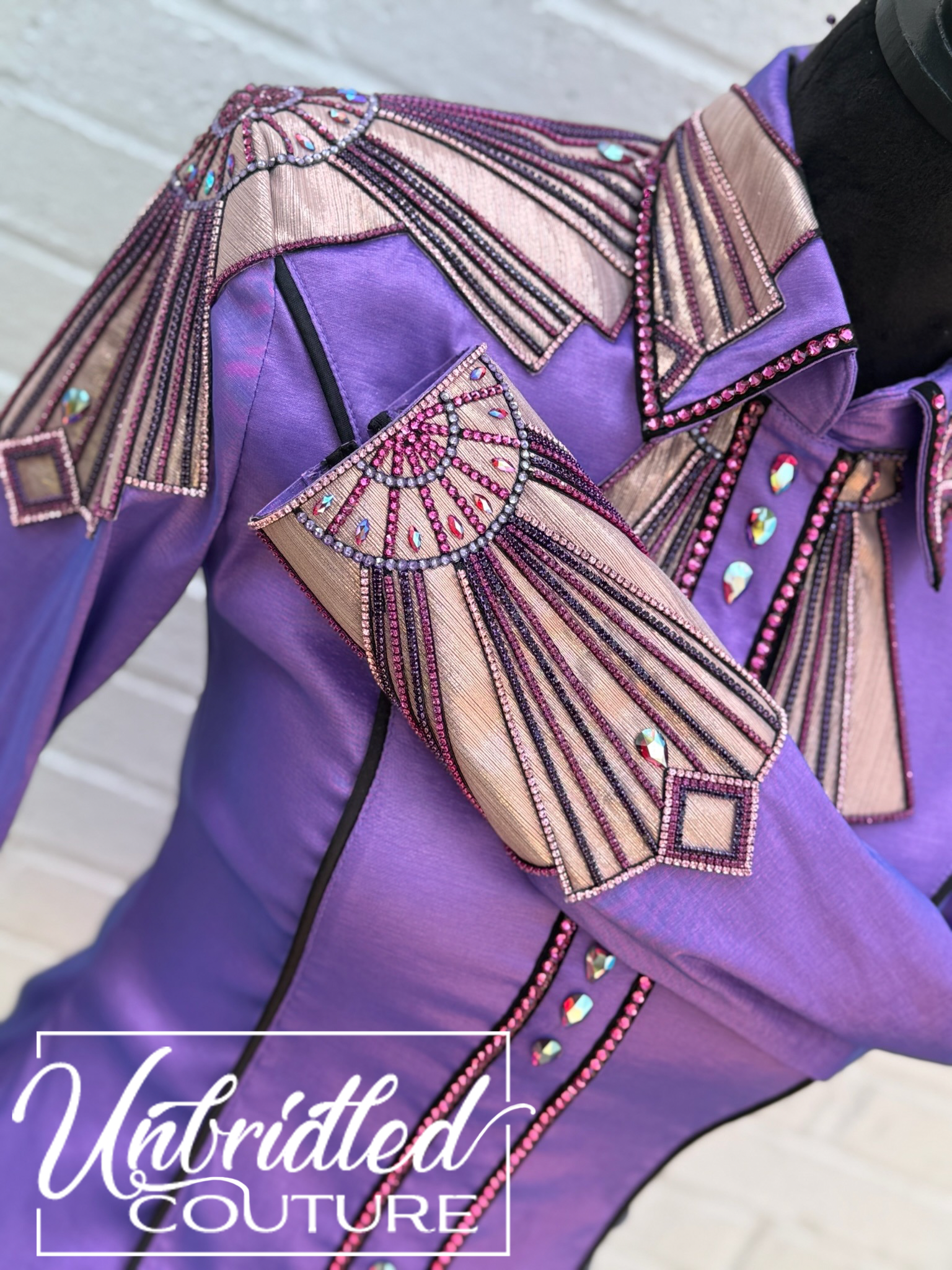 Purple shimmer base day shirt with shades of purple and scarlet accents. Rose gold shimmer underlay design. Black princess seam piping. Base of shirt has stretch and can be altered up or down.