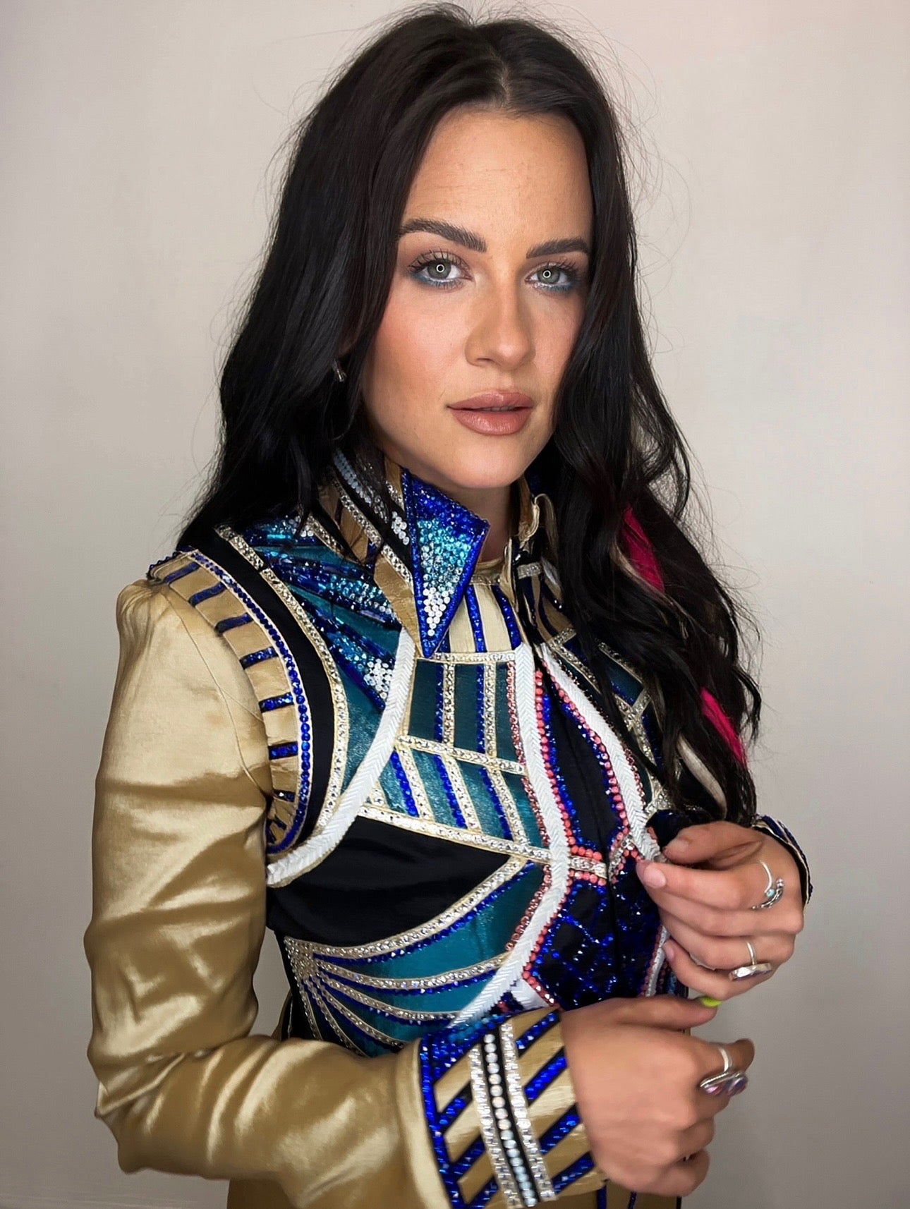 This piece was used for one show and is in great condition! A beautiful shirt that can be worn by itself or with the bolero.