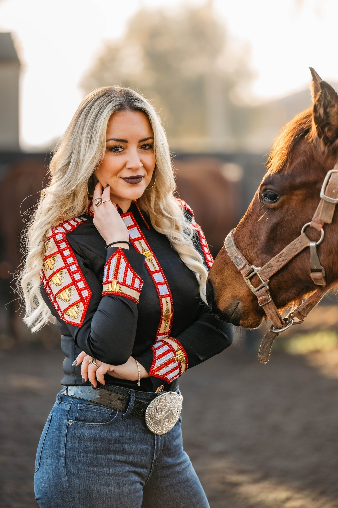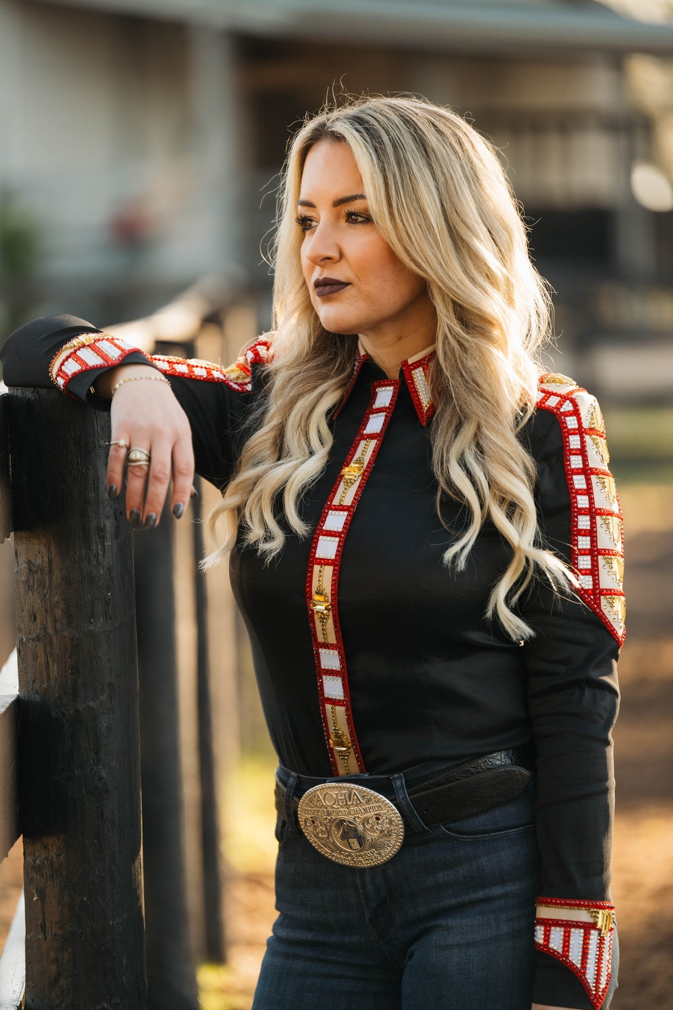 Black base day shirt with red, gold, and opal accents. Base of shirt has stretch and can be altered up or down.