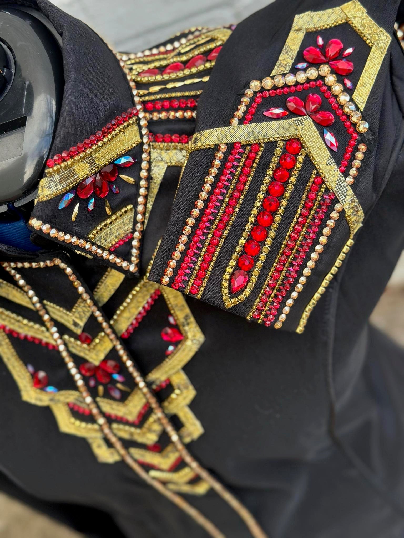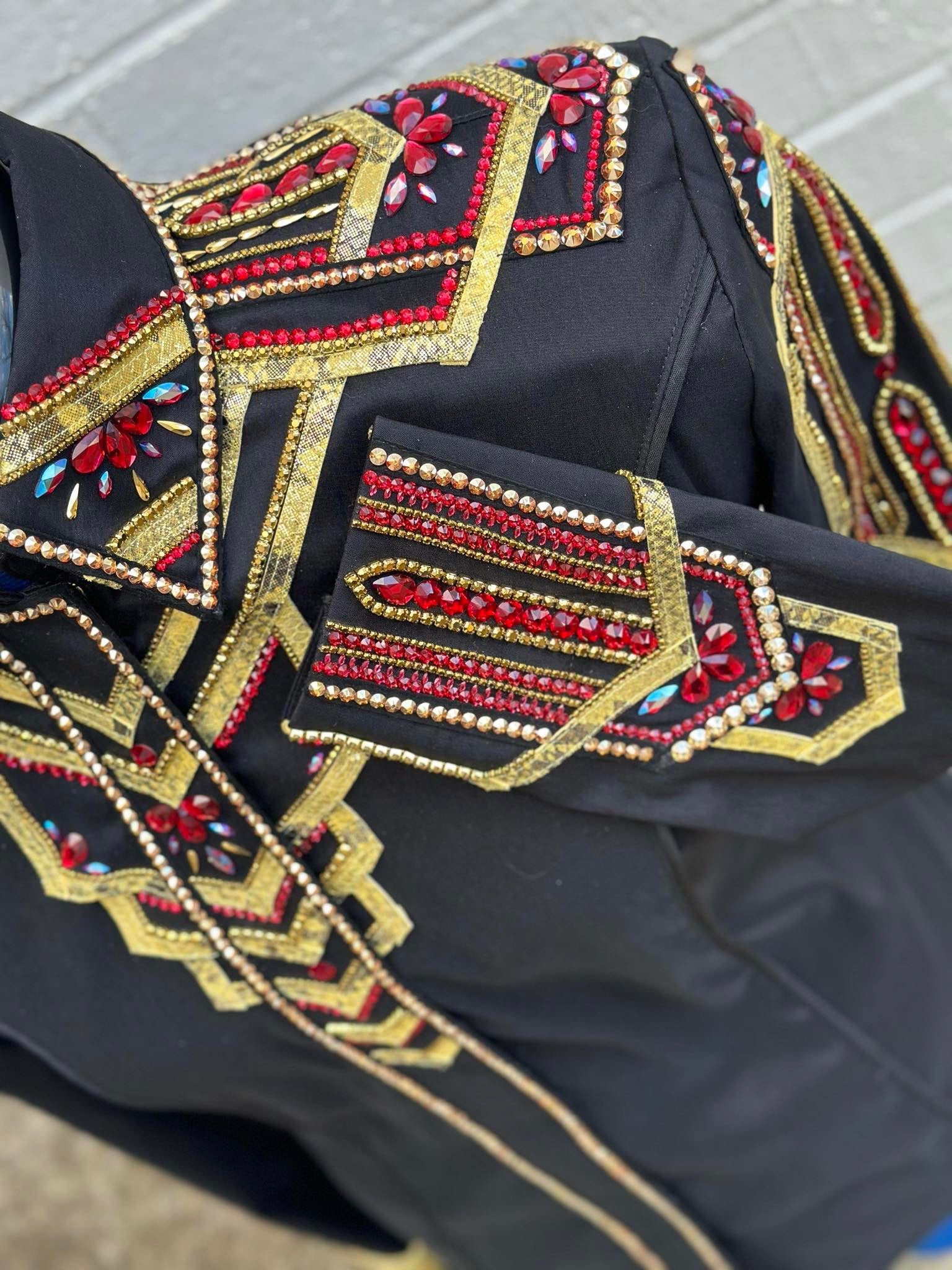 Black base day shirt with gold design. Ruby red and gold accents. Base of shirt has stretch and can be altered up or down.