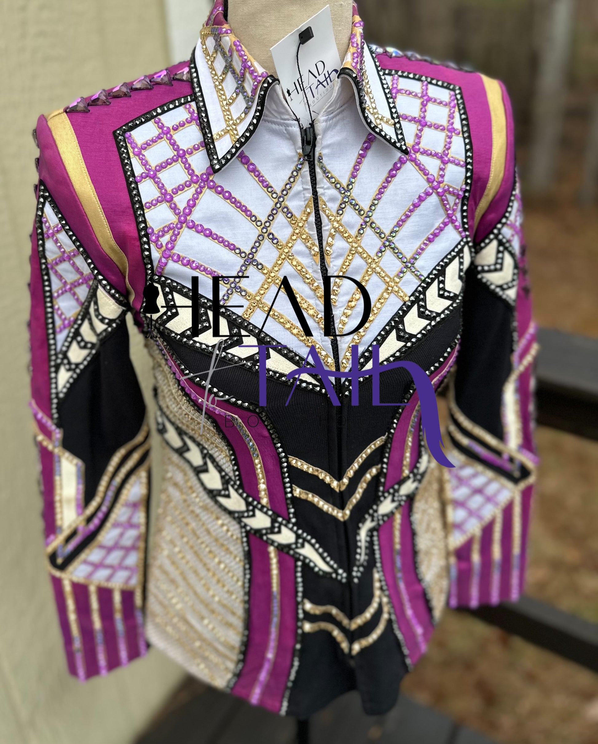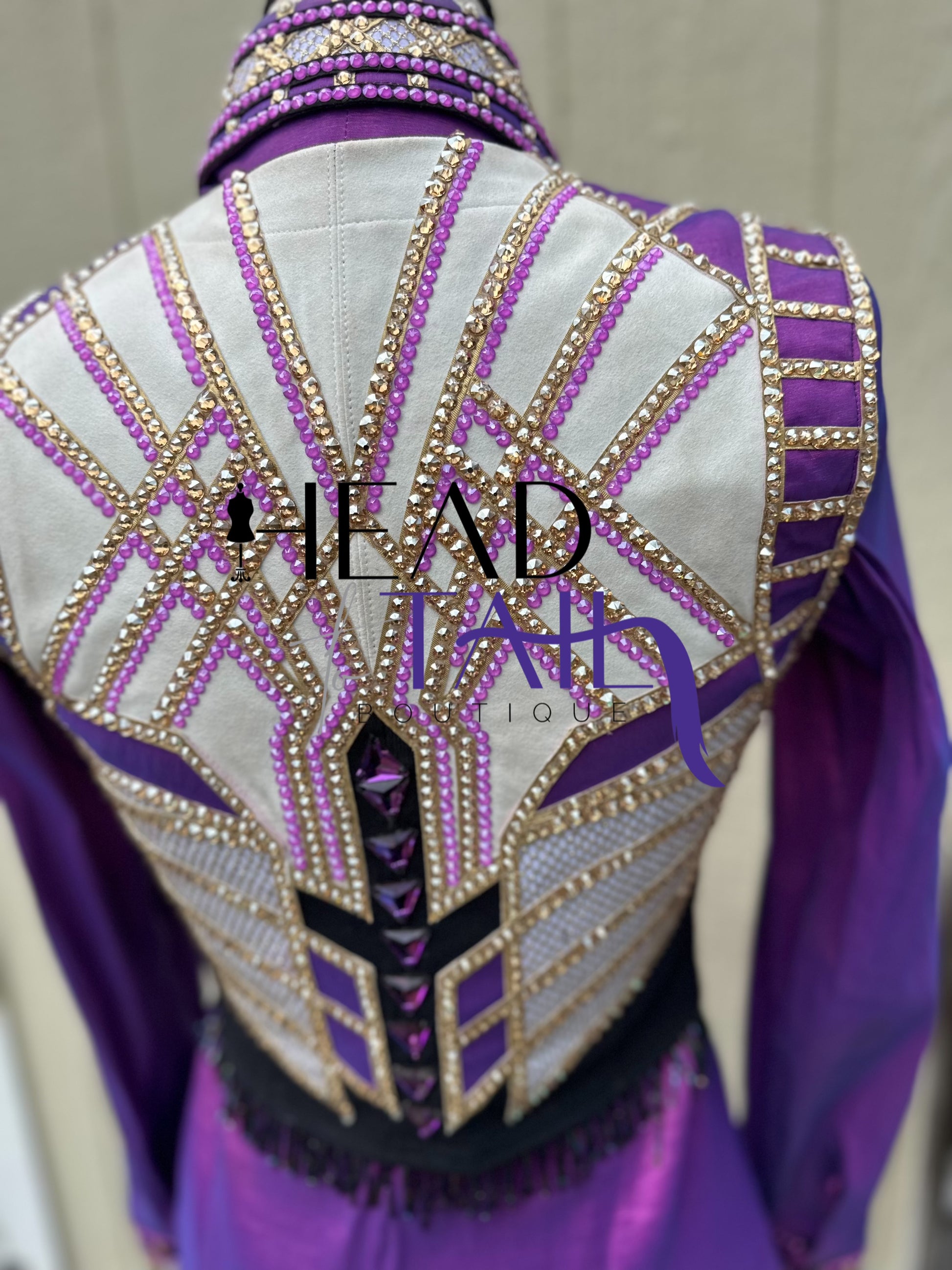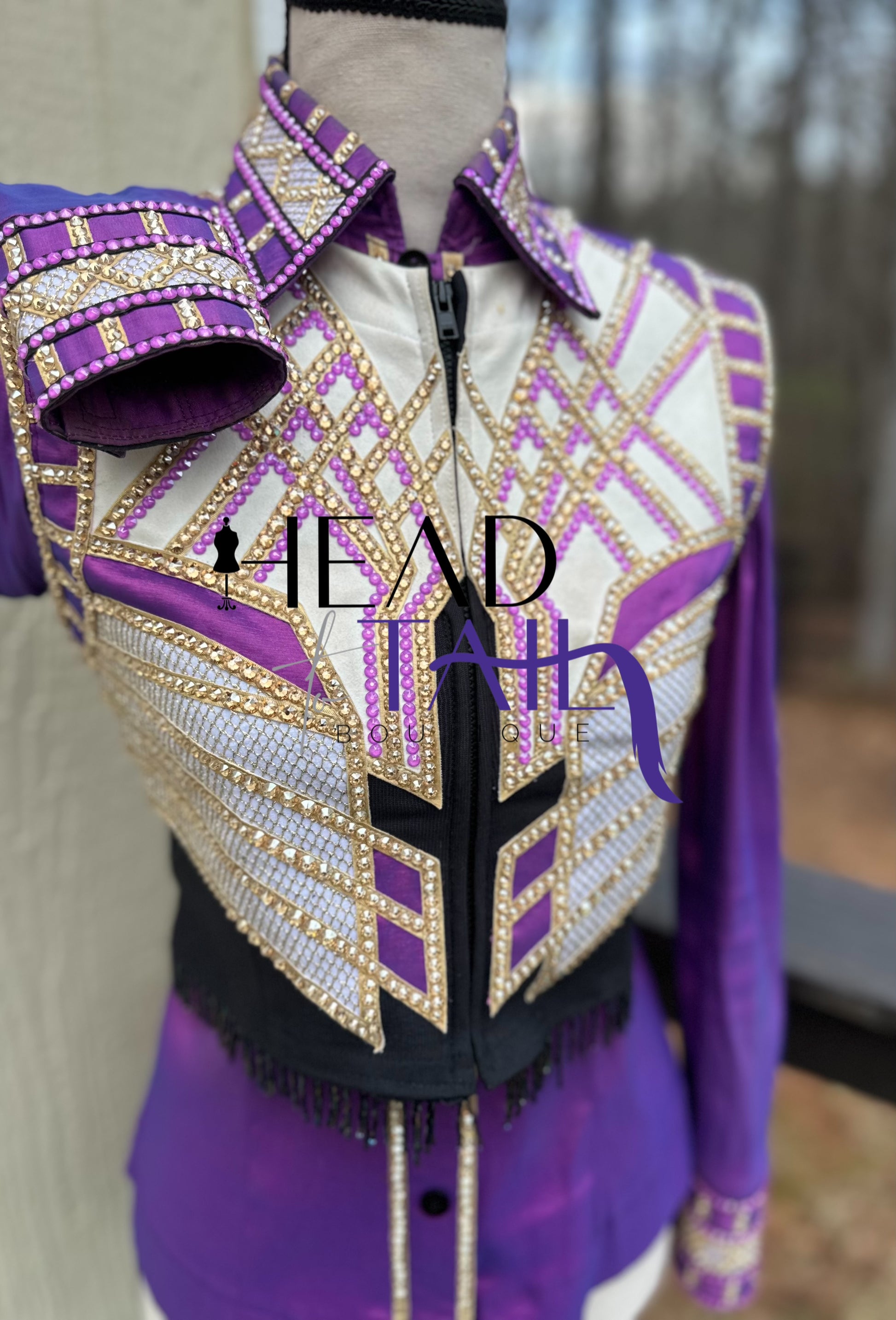 Unbridled Couture Showmanship, Horsemanship, Vest & Day Shirt Magenta Purple & Gold 4 Piece Set - YOUTH Large/ADULT XS