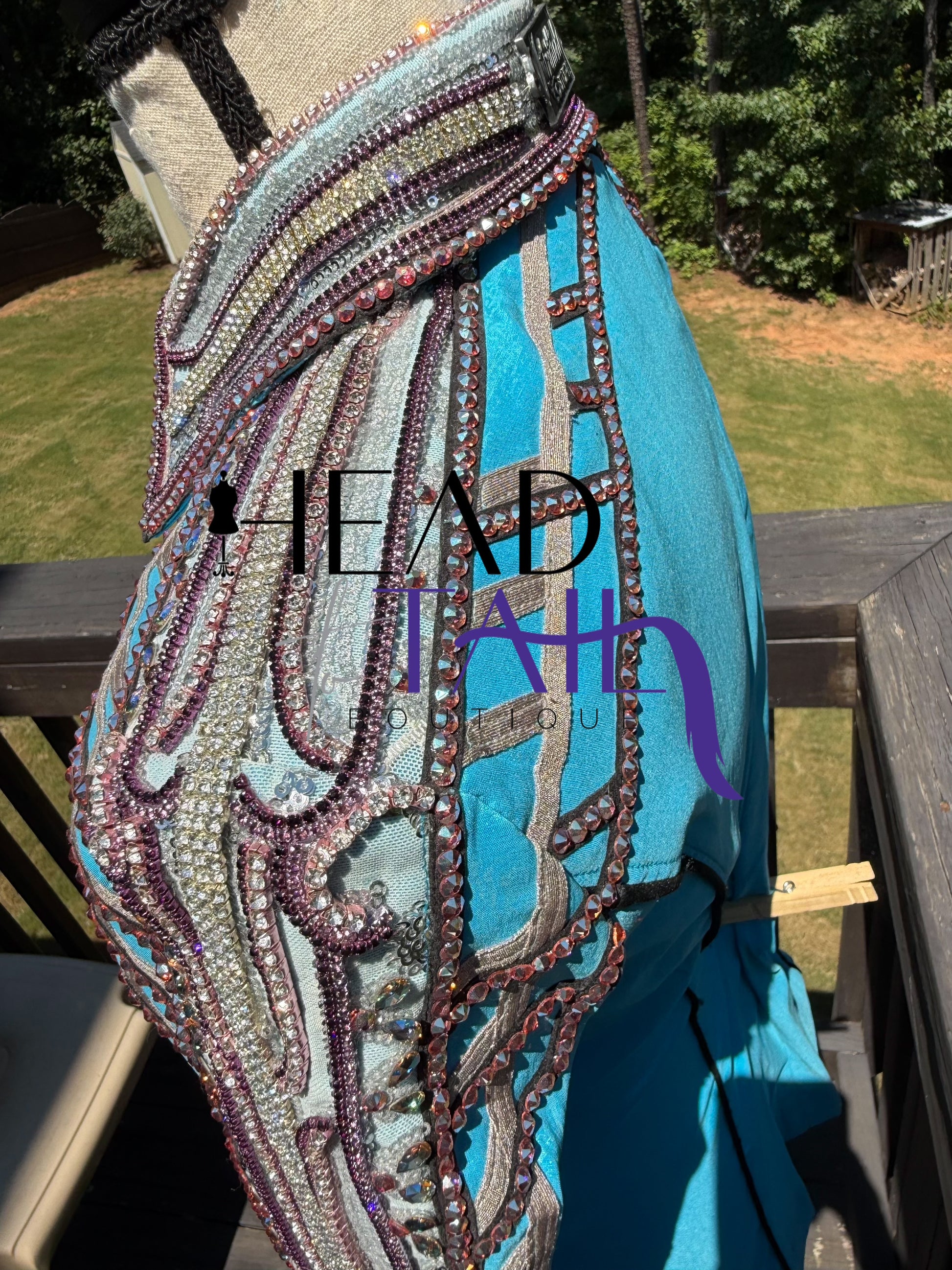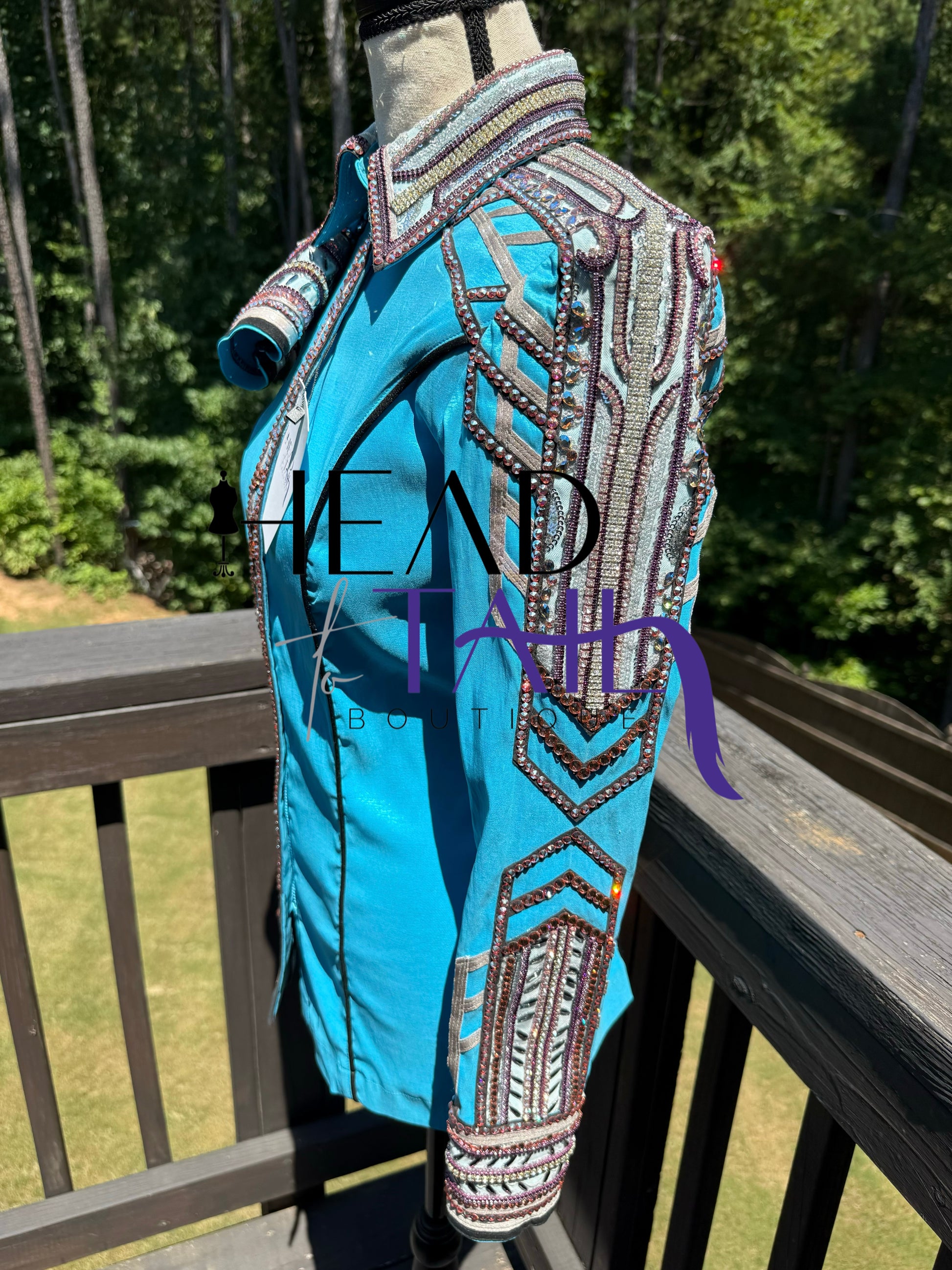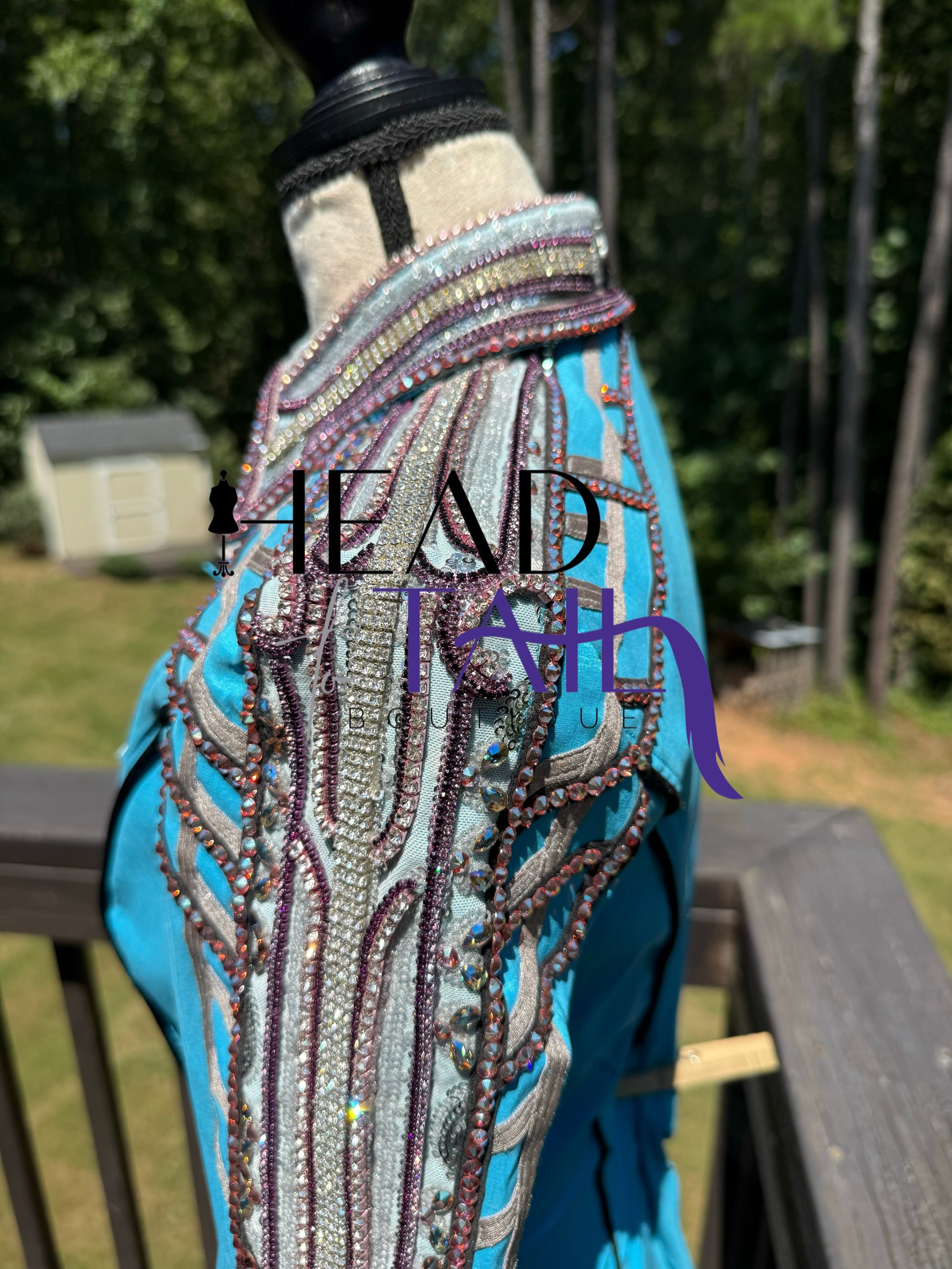 Sky Blue base Day Shirt with purple and silver accents on the cuffs, sleeves, shoulders and collar. Base of shirt has stretch and can be altered up or down.