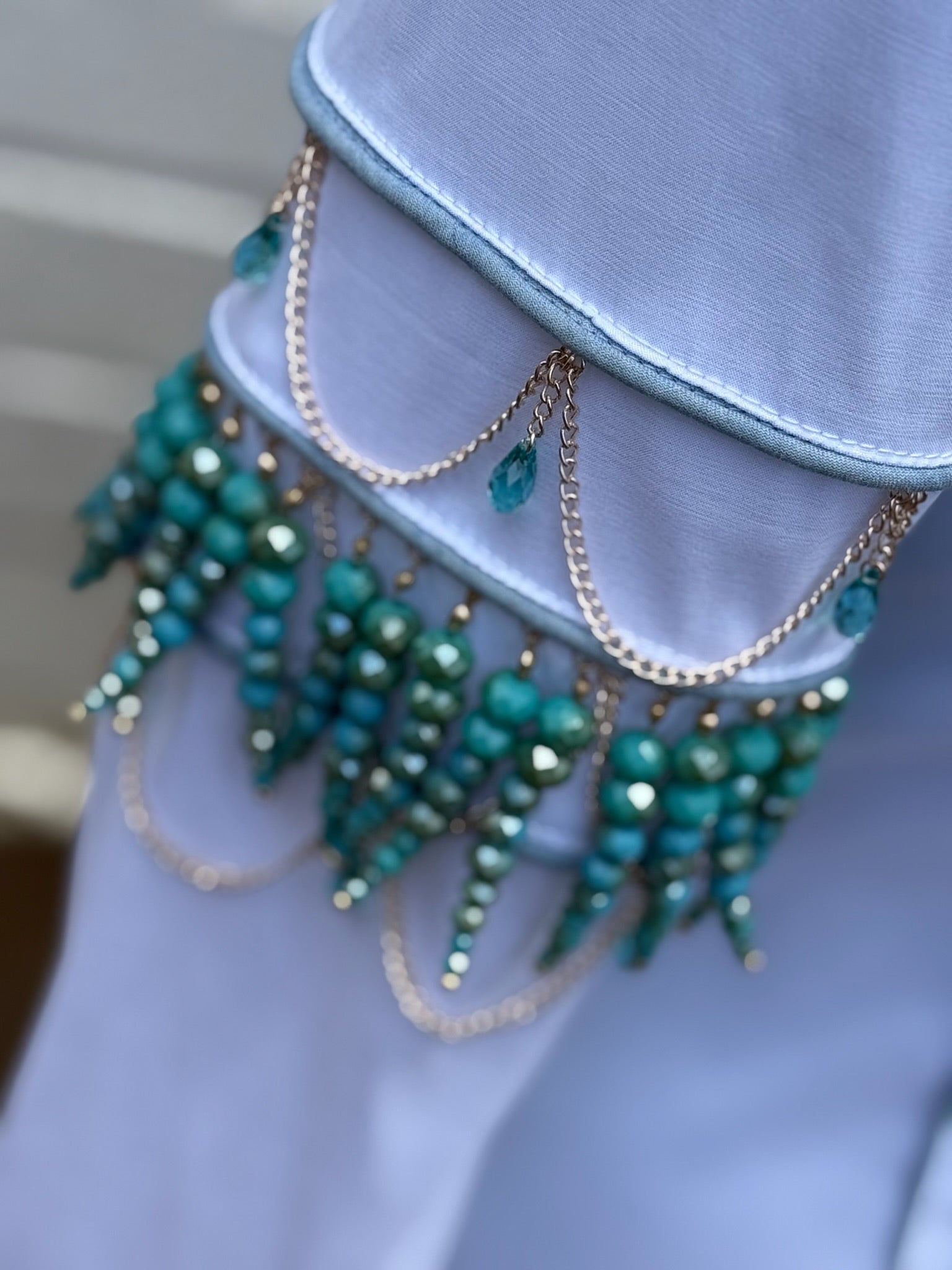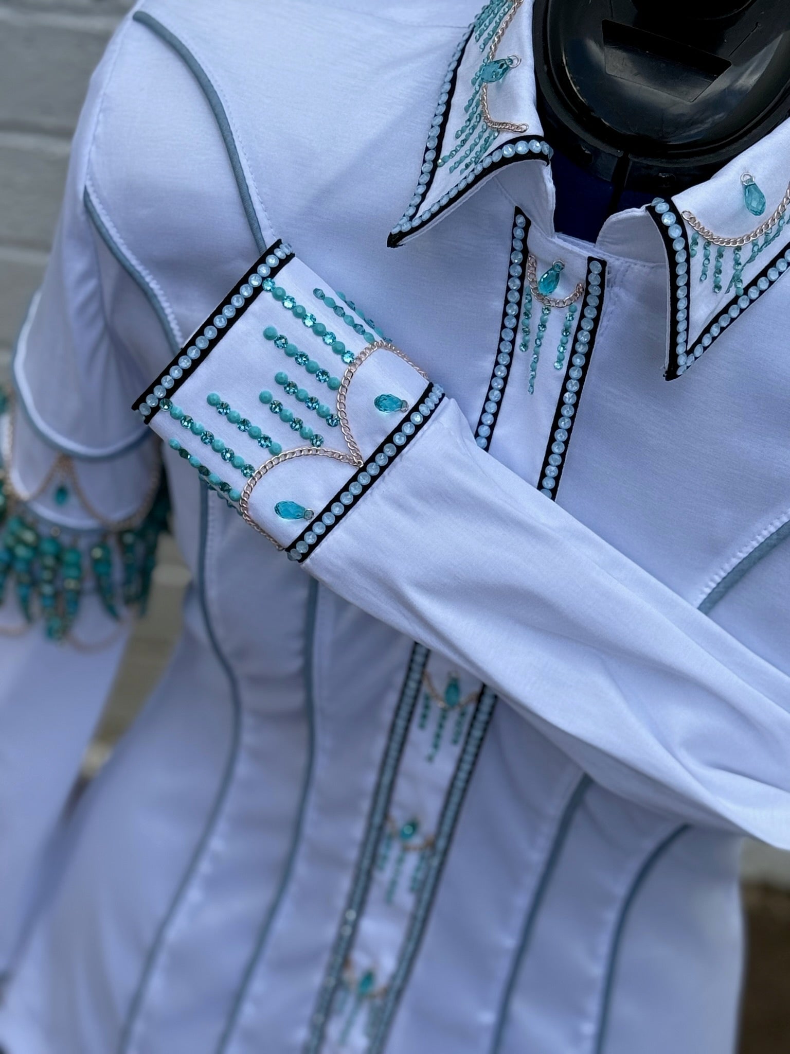 White base day shirt with custom-beaded, turquoise fringe. Base of shirt has stretch and can be altered up or down.