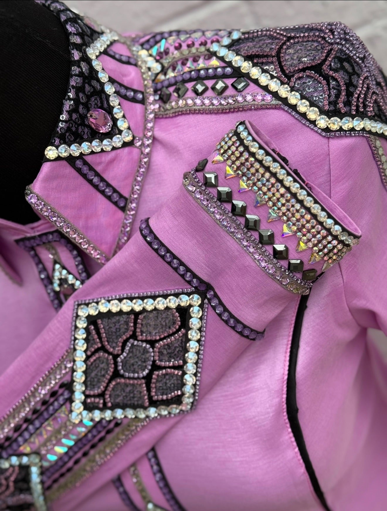 Orchid base day shirt with lilac, moonlight, and purple accents. Base of shirt has stretch and can be altered up or down.
