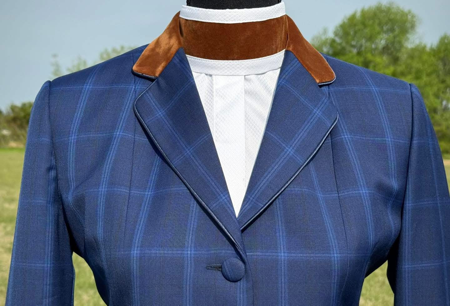 White Boo Yah hunt shirt with thick rust velvet ribbon and navy piping collars. Size 32. Please refer to size chart.
