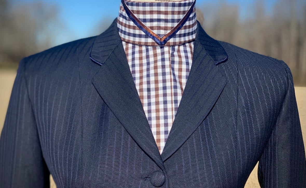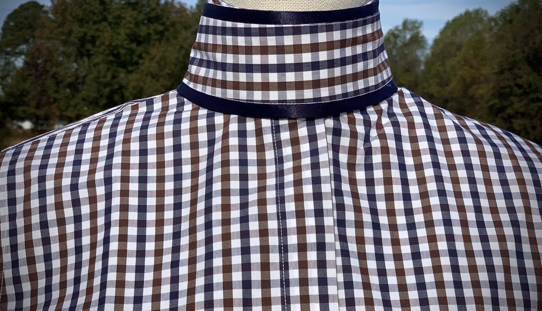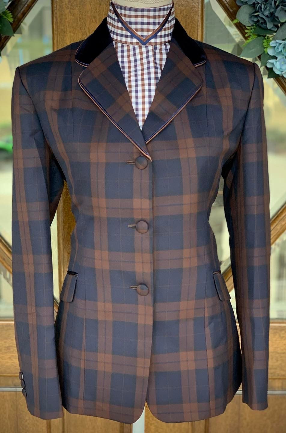 White with navy/brown checks Boo Yah hunt shirt with which brown ribbon stripe (not pictured) and brown/navy V collars. Size 38. Please refer to size chart.